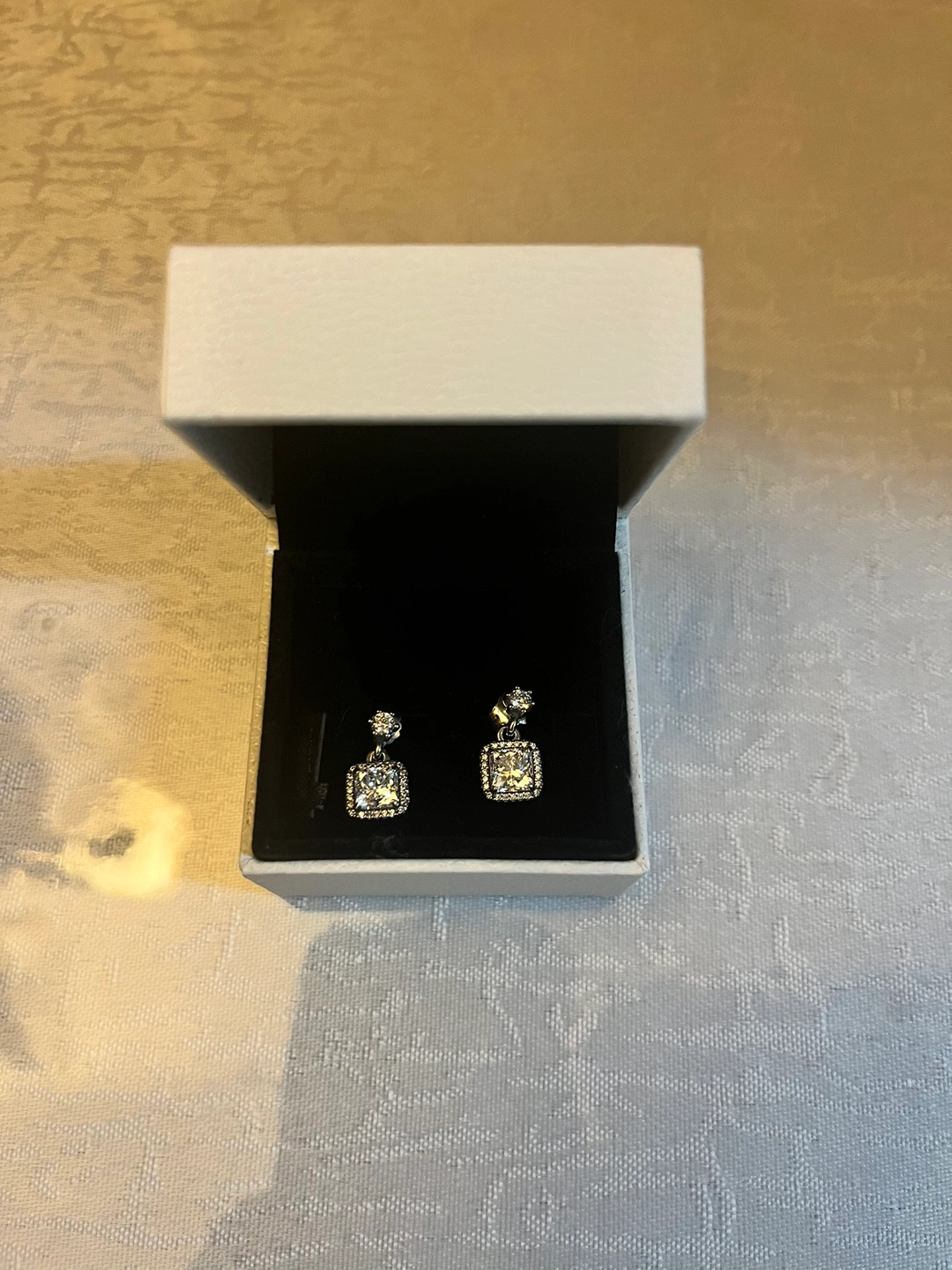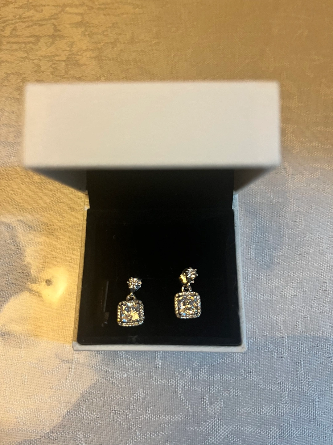 Stone: Cubic Zirconia Colour: Clear Metal: Sterling silver Material: No other material Dimensions Depth: 5.5 mm Height: 8 mm Width: 8 mm Condition: used once Recently cleaned Box is included Price is negotiable within reason