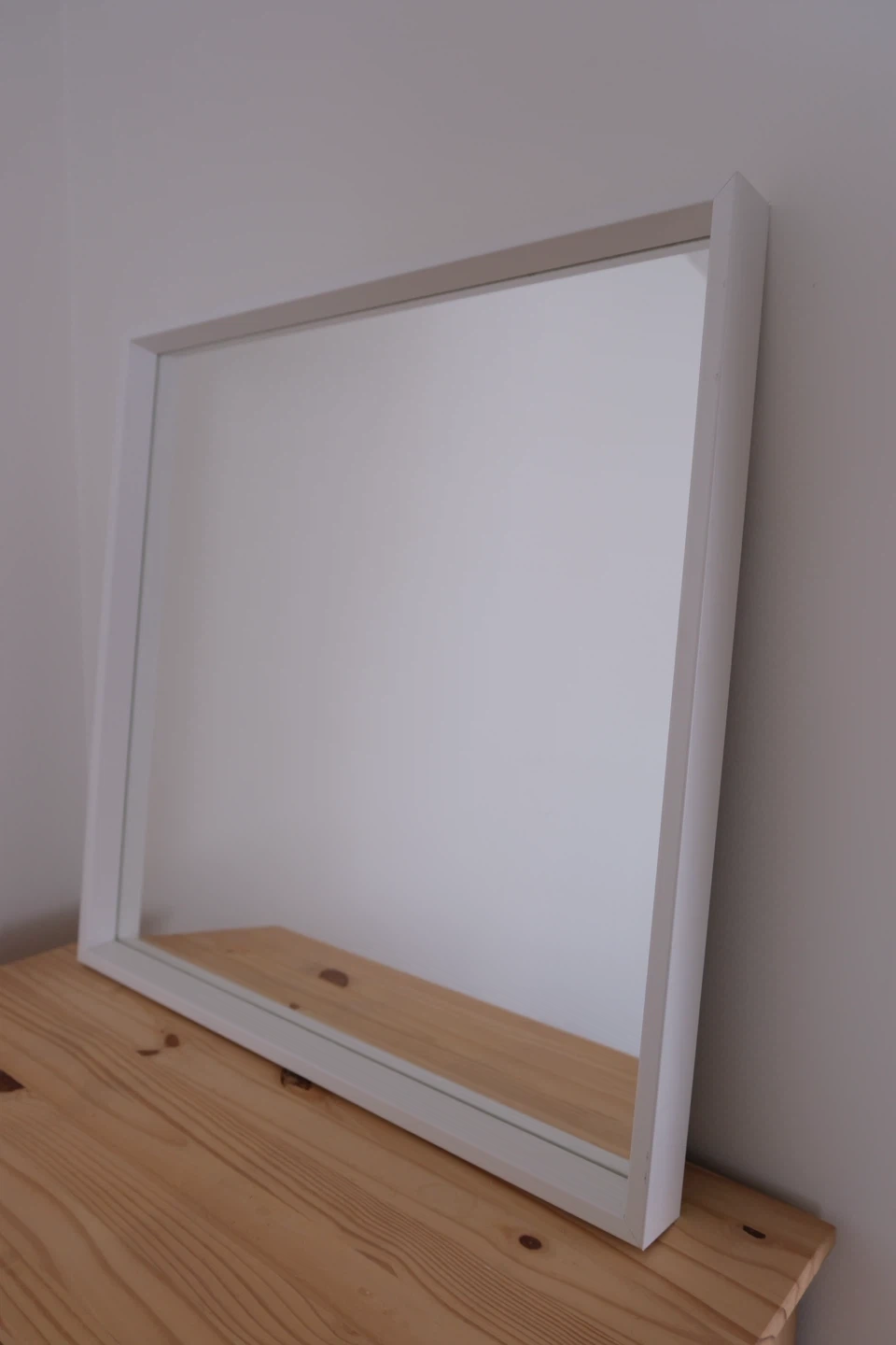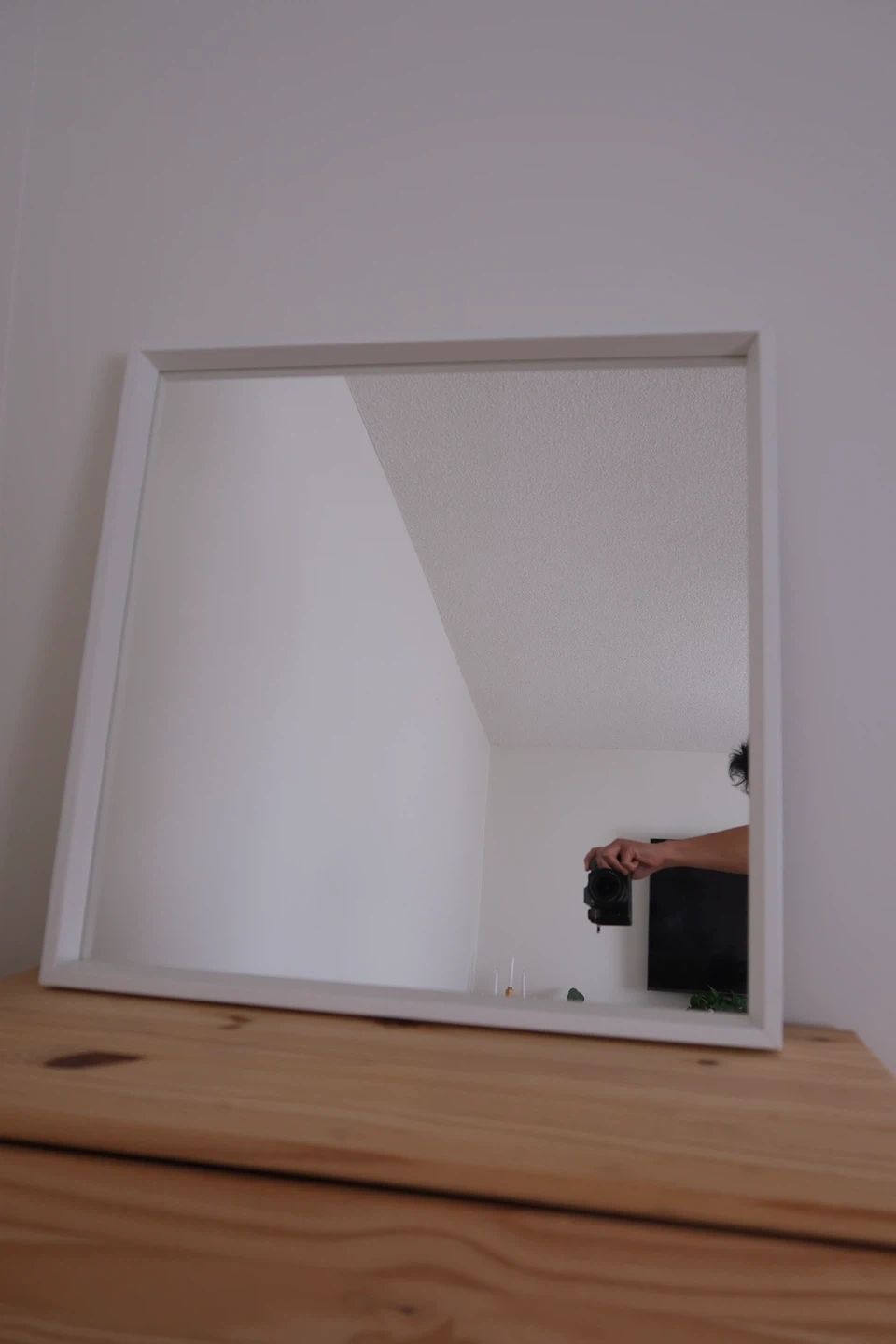 Selling a square mirror with a white frame. It's in great condition and would look lovely in any room. It's a simple and elegant design that would complement any decor