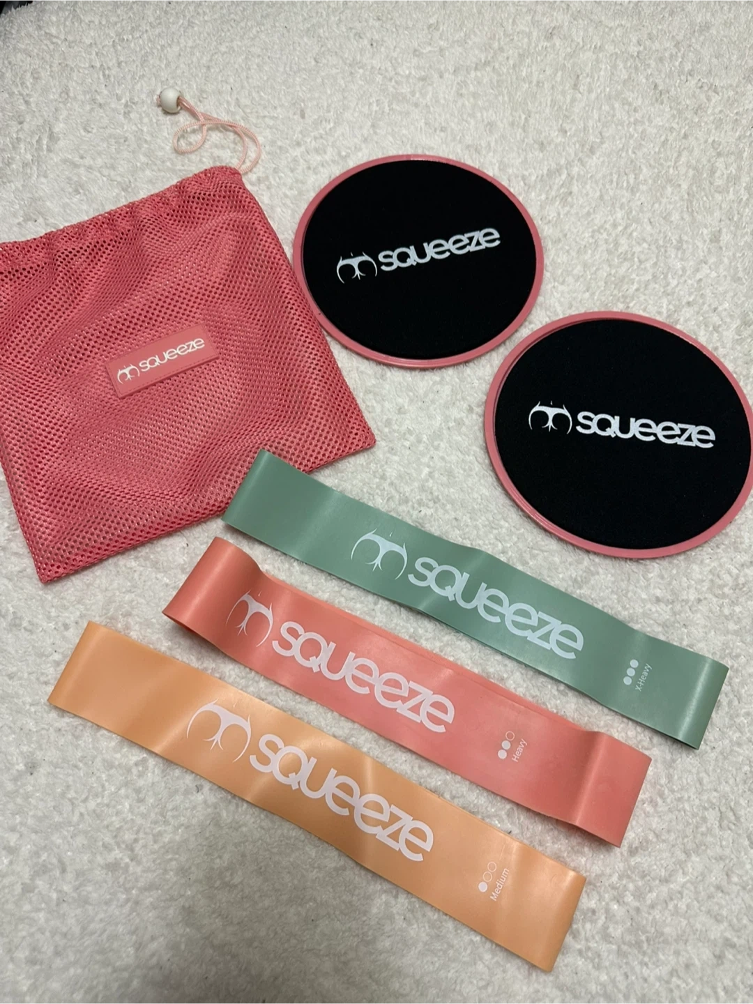 149Get your sweat on with this Squeeze exercise set! It includes a pair of sliders and three resistance bands (light, medium, and heavy). Comes with a handy carrying bag to keep everything organized