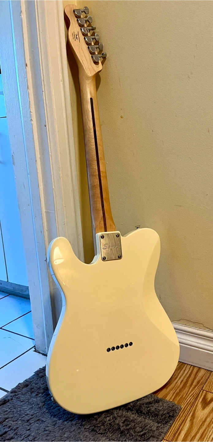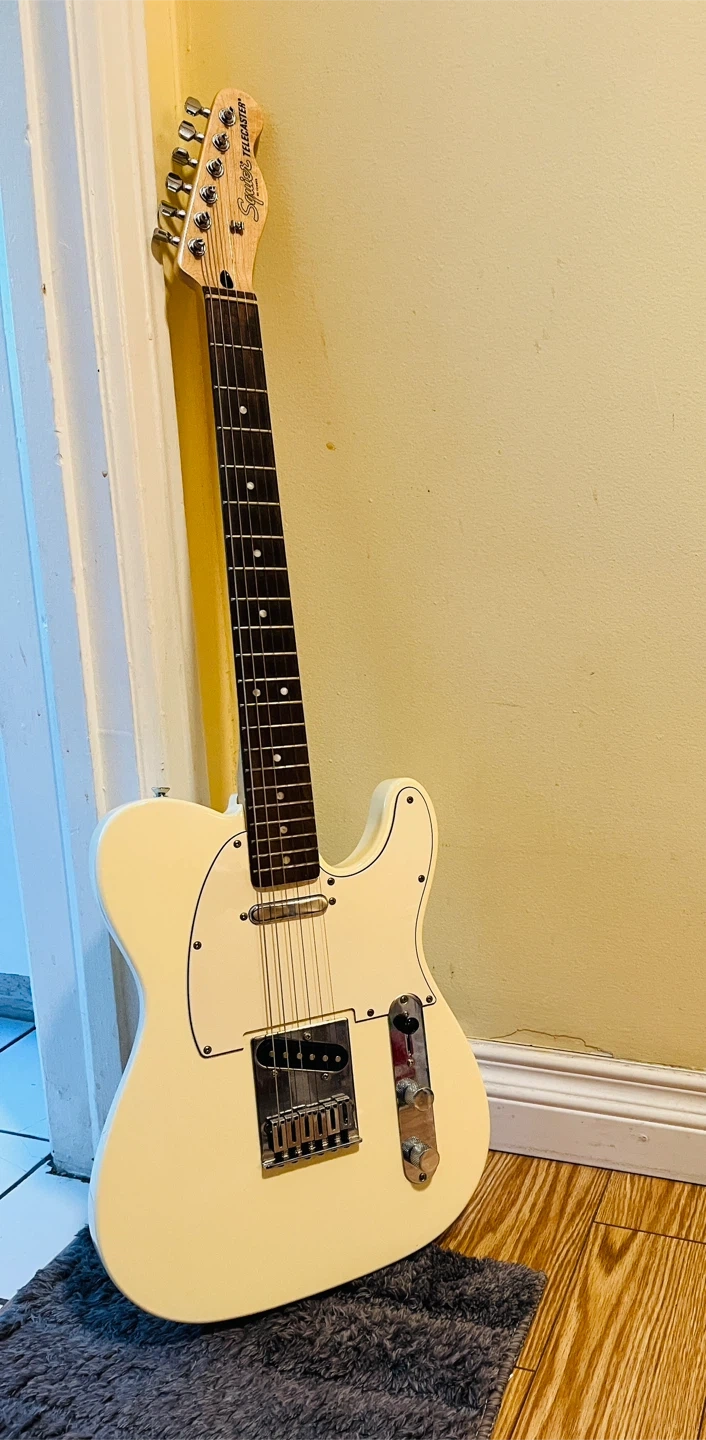 Selling a cream-colored Squier Telecaster electric guitar. It's in great shape and ready for a new home! Perfect for beginners or experienced players looking for that classic Tele sound Pick up at Broadview avenue Open to offers