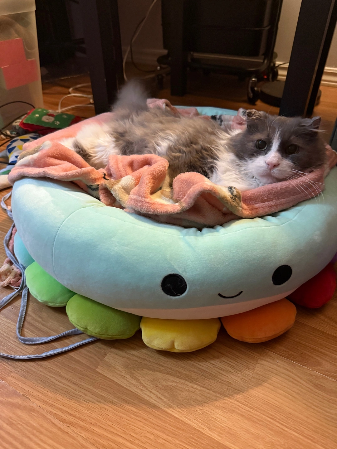 $45 CAT NOT INCLUDED lol Give your furry friend the ultimate comfort! This 24-inch Squishmallow-style pet bed is plush, cozy, and perfect for cats or small dogs. We bought for our cat but he no longer uses it. It is rip/tear free we, he likes to have his beds covered in blankies. Details: Size: 24 inches Gently used condition Soft and plush - provides a secure, restful space Clean and ready for a new pet Smoke-free home Perfect for cats or small dogs who love to curl up in cozy spots! Pickup Locations: Pickering (evenings/weekends for local meetup) Scarborough (Monday-Friday, 9am-5pm at my workplace)