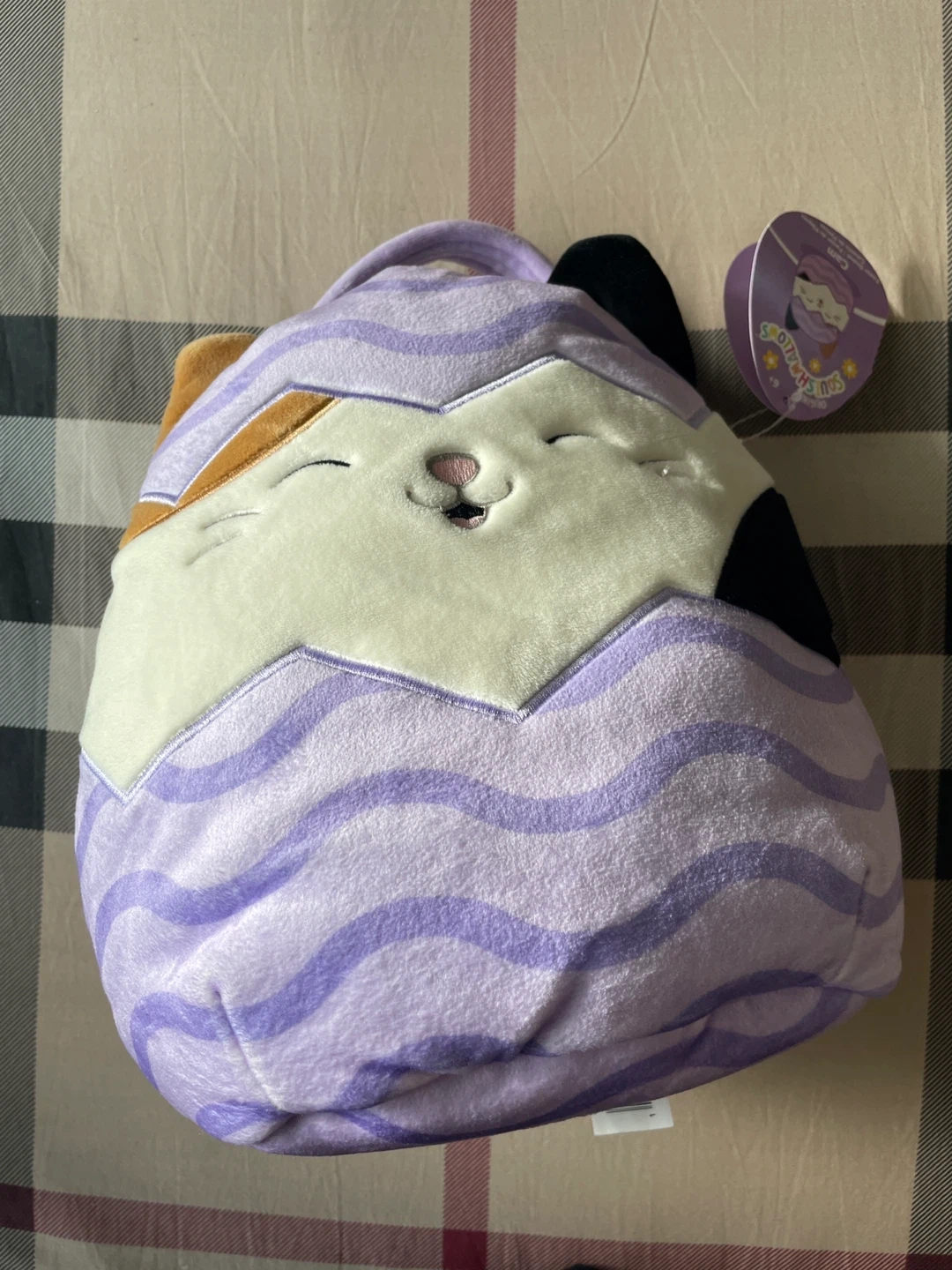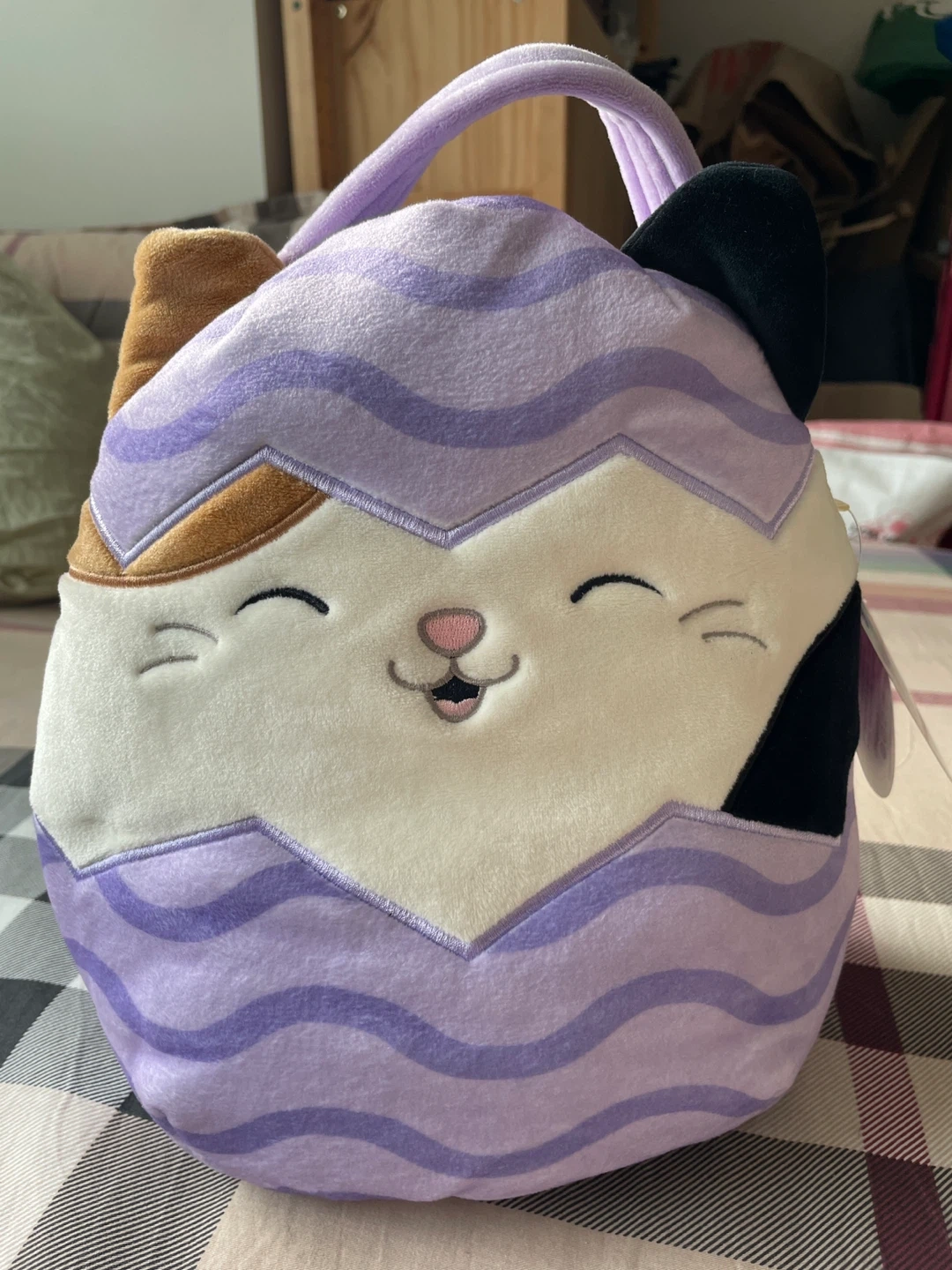 Cash payment only! Plush squishmellow goodie bag Selling a super cute Squishmallows Calin the Cat plush toy! It's in the shape of an egg and has a lovely purple and white design. Perfect for cuddling or as a decorative piece!