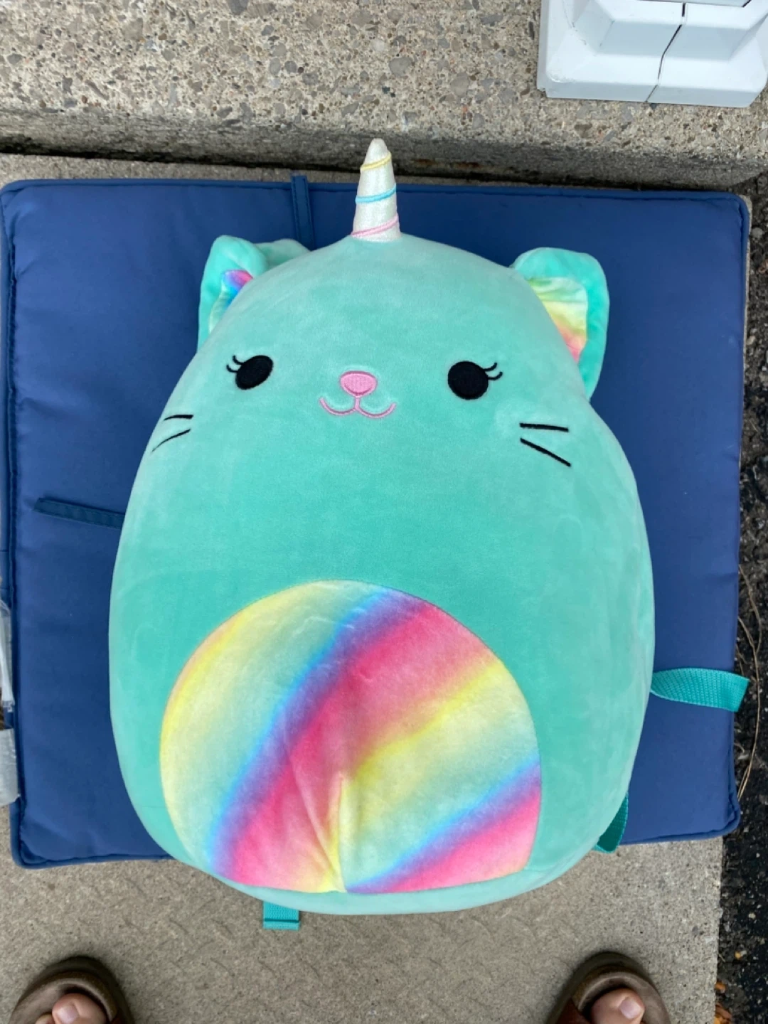 10This Squishmallows backpack is in great condition! It's a 14-inch cat unicorn design in a lovely teal colour with rainbow accents. Perfect for carrying your essentials in style!