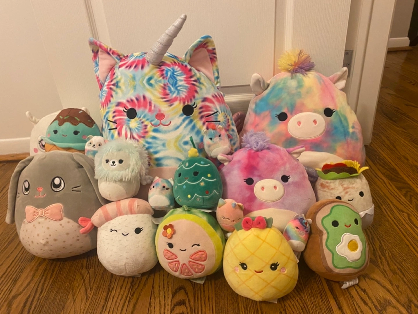 Large collection of Squishmallows. Various colours and styles. Includes unicorn, bunny, llama, and other unique characters. Perfect for collectors or children.