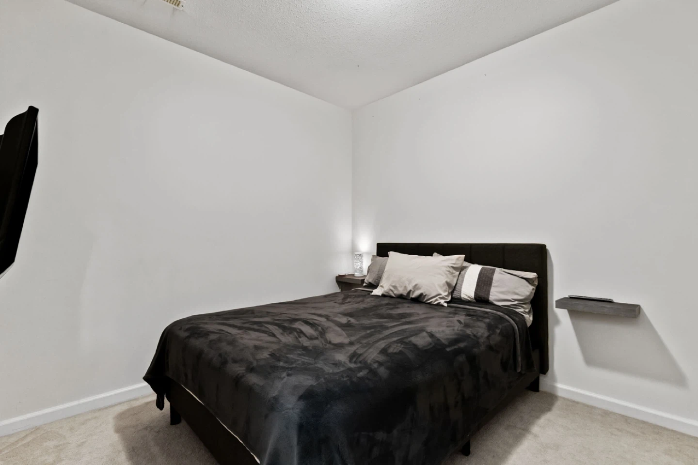 Dark grey upholstered queen bed frame with a padded headboard. It's a sturdy and stylish addition to any bedroom. The bed frame requires assembly. Includes all hardware.