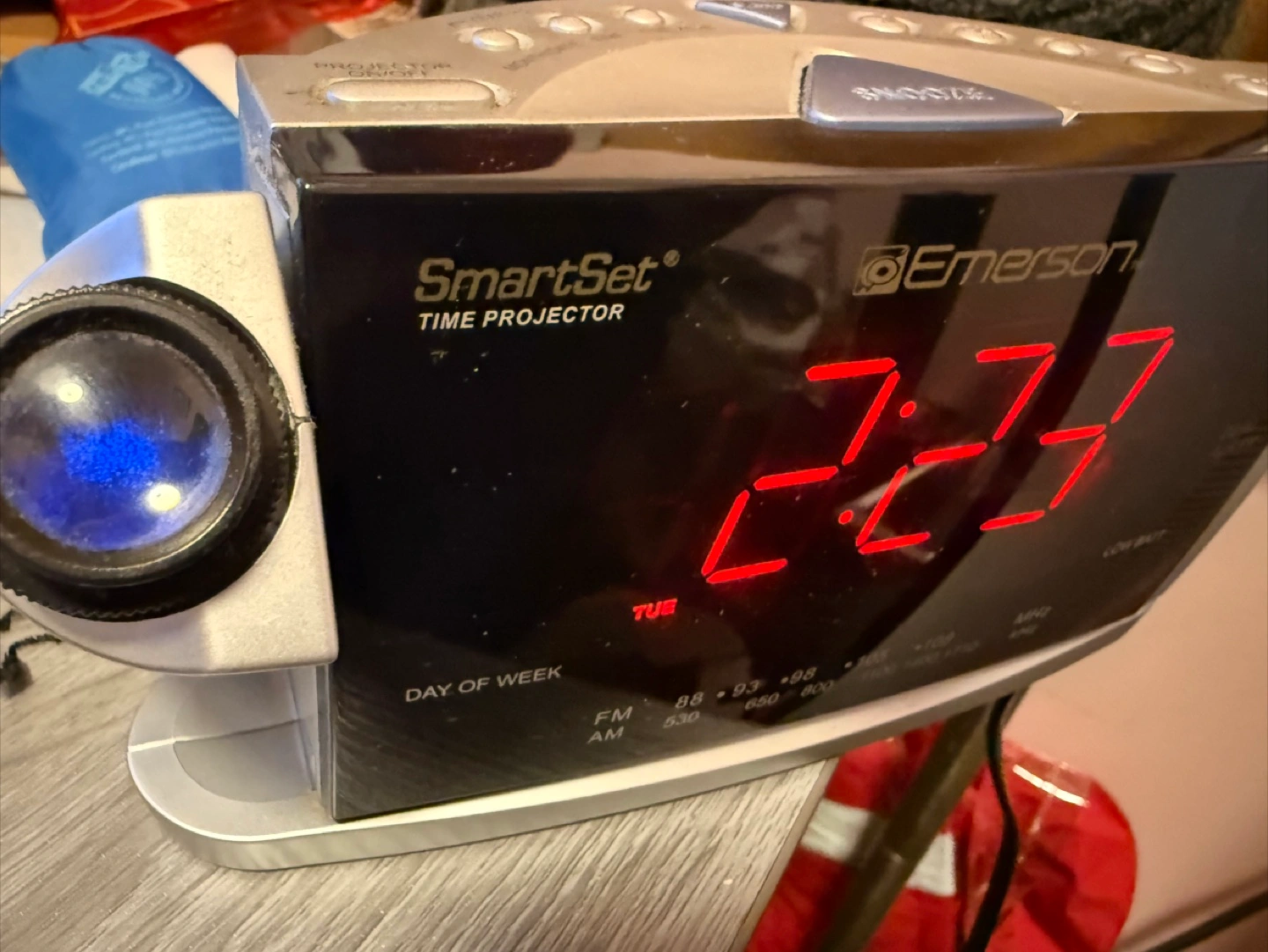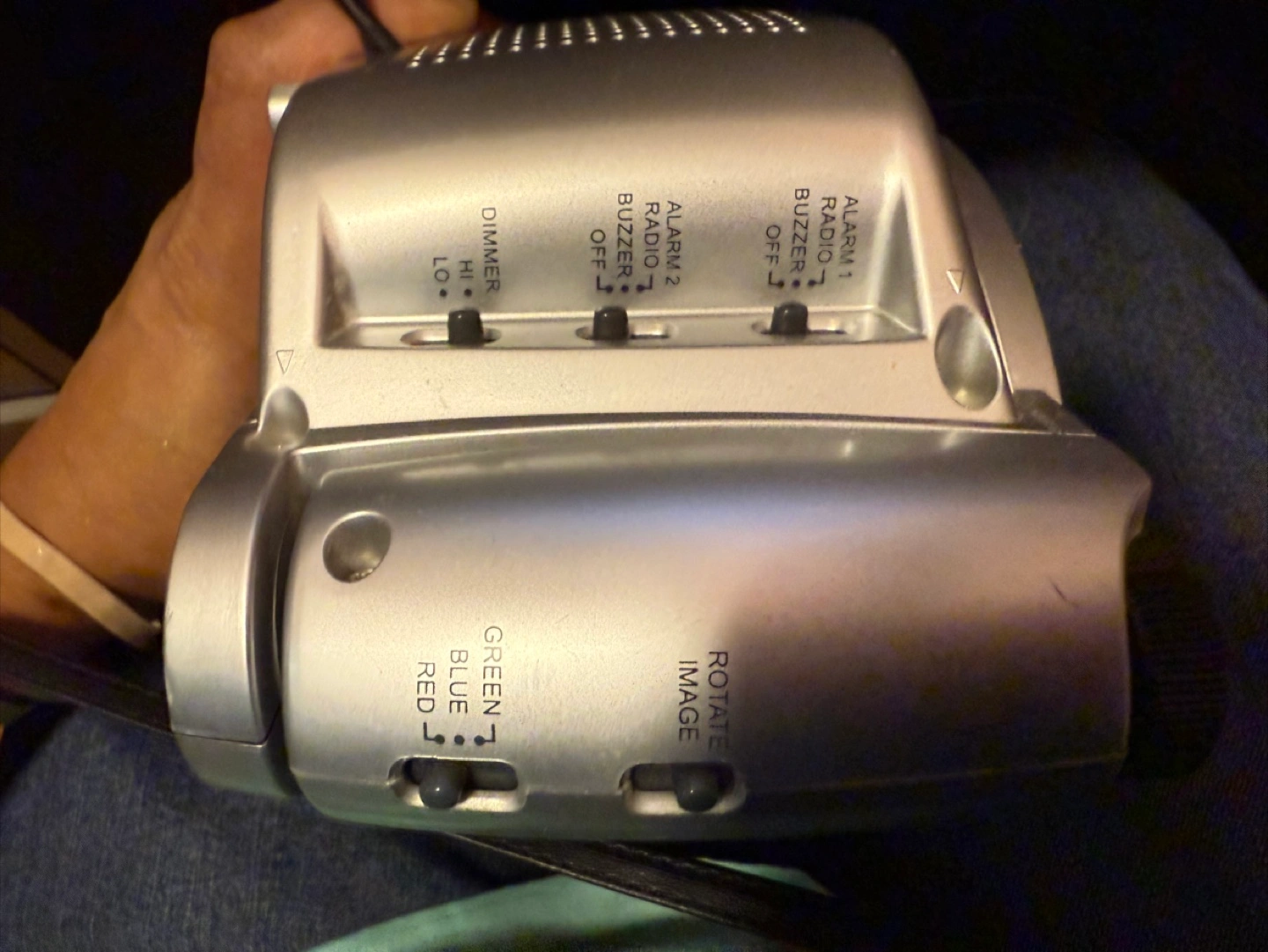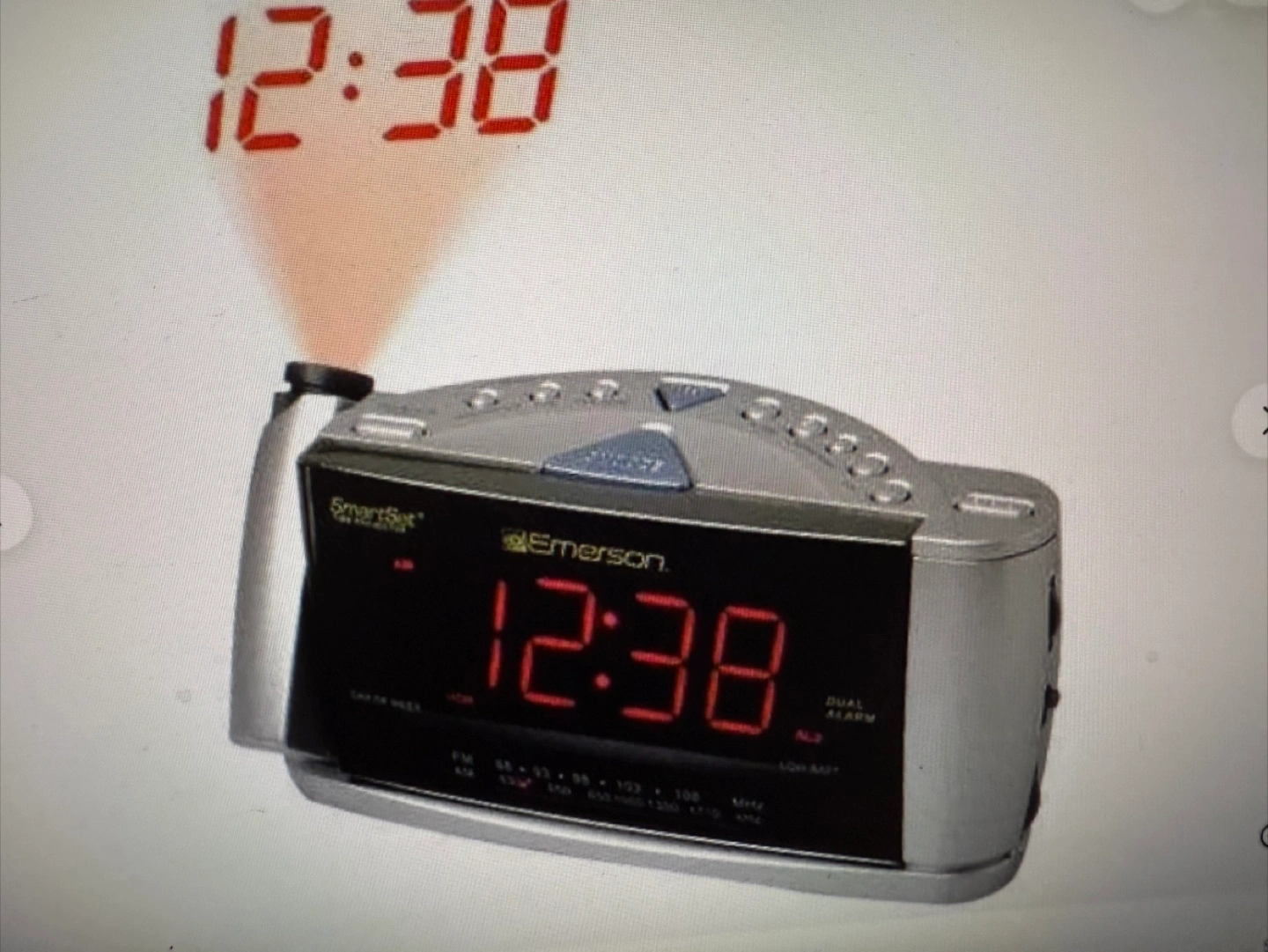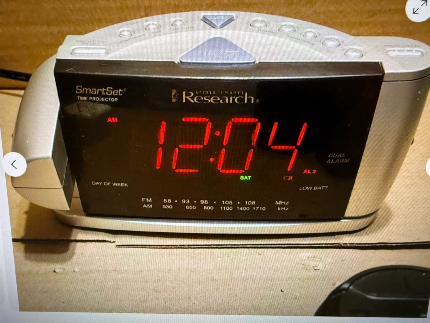 Fancy Open no box was $115 Silver alarm clock. Features a projected time display. Displays day of the week and AM/FM radio functions. Great for checking the time in the middle of the night without needing to open your eyes.