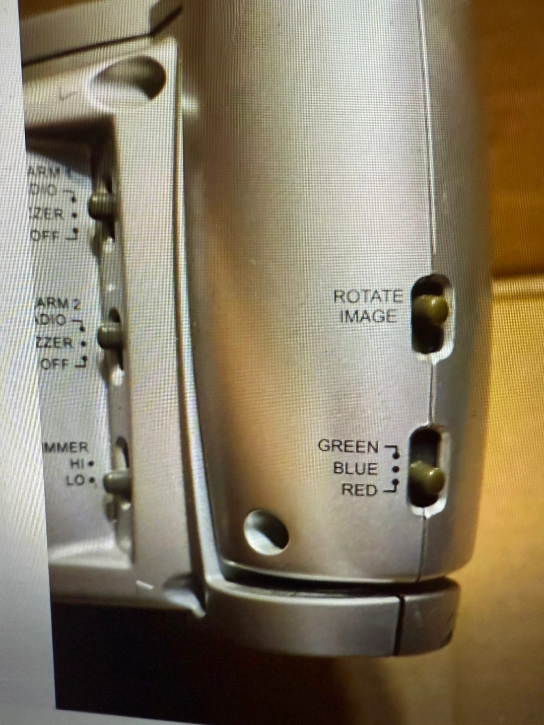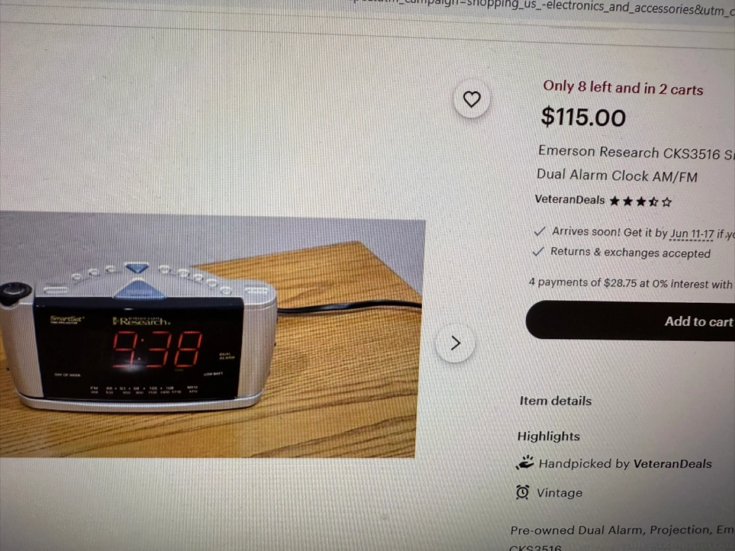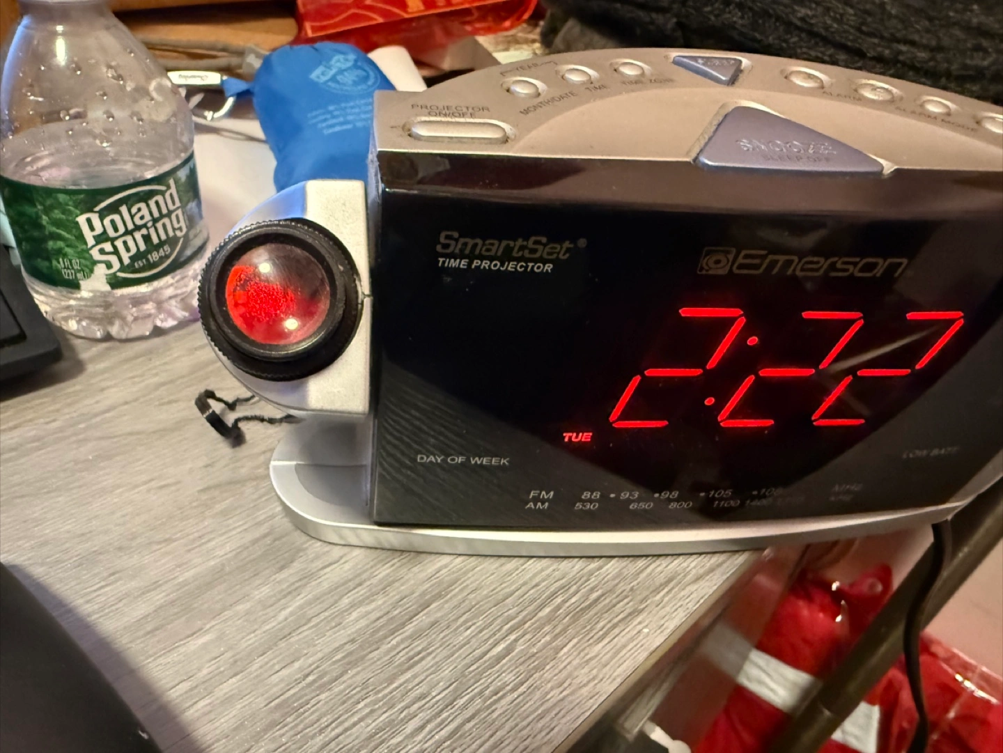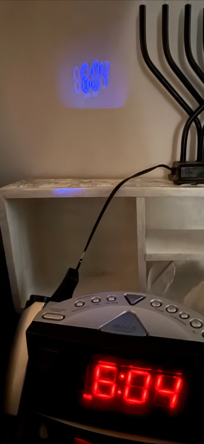 Fancy Open no box was $115 Silver alarm clock. Features a projected time display. Displays day of the week and AM/FM radio functions. Great for checking the time in the middle of the night without needing to open your eyes.
