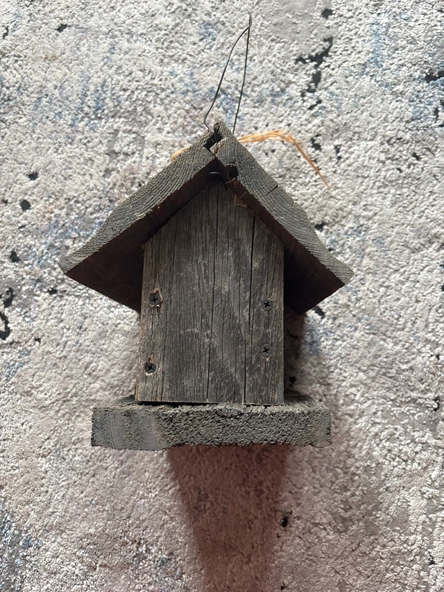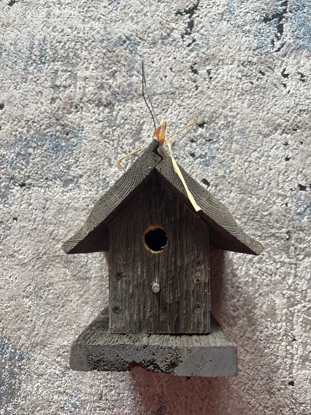This rustic wooden bird house provides a cozy sanctuary for your feathered friends, featuring a charming design and natural appeal. It is in good condition. This little abode is just waiting to welcome some chirpy tenants! If the ad is still up, the bird house is still ready for a new home. Cash accepted.
