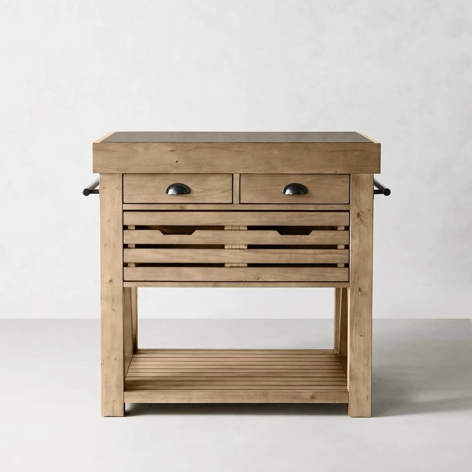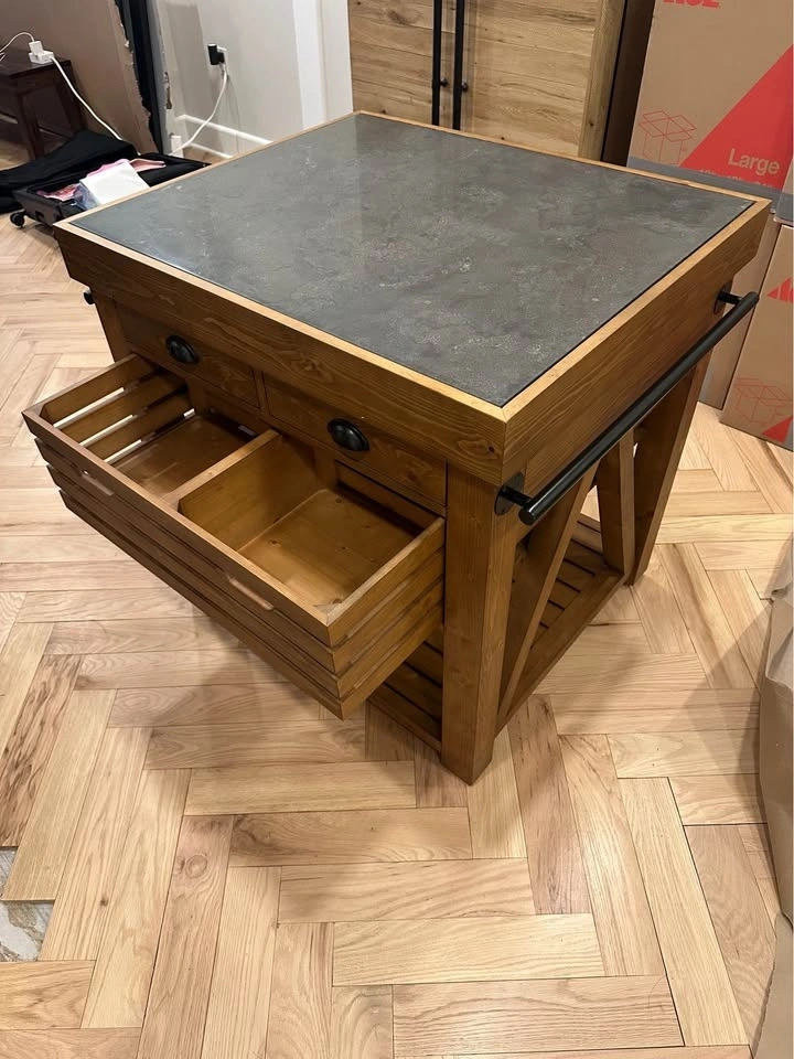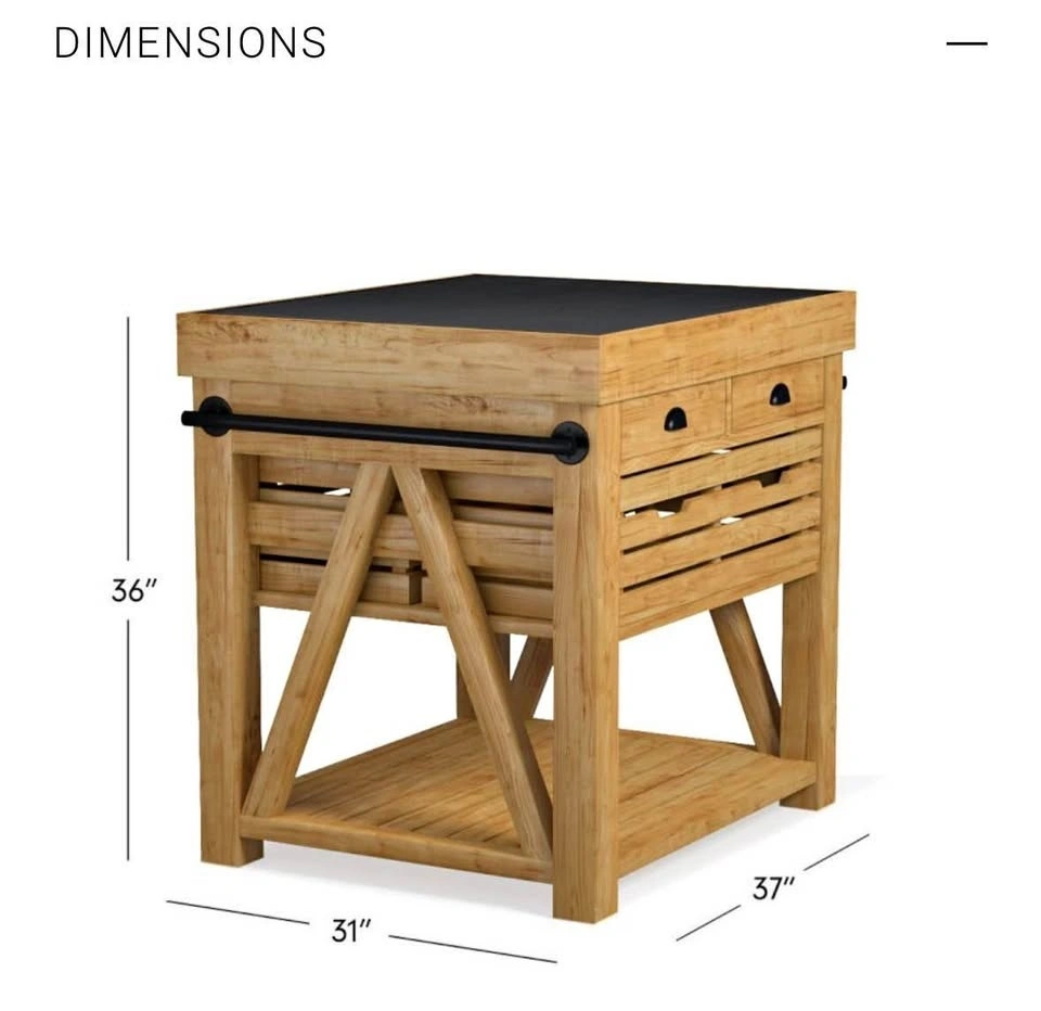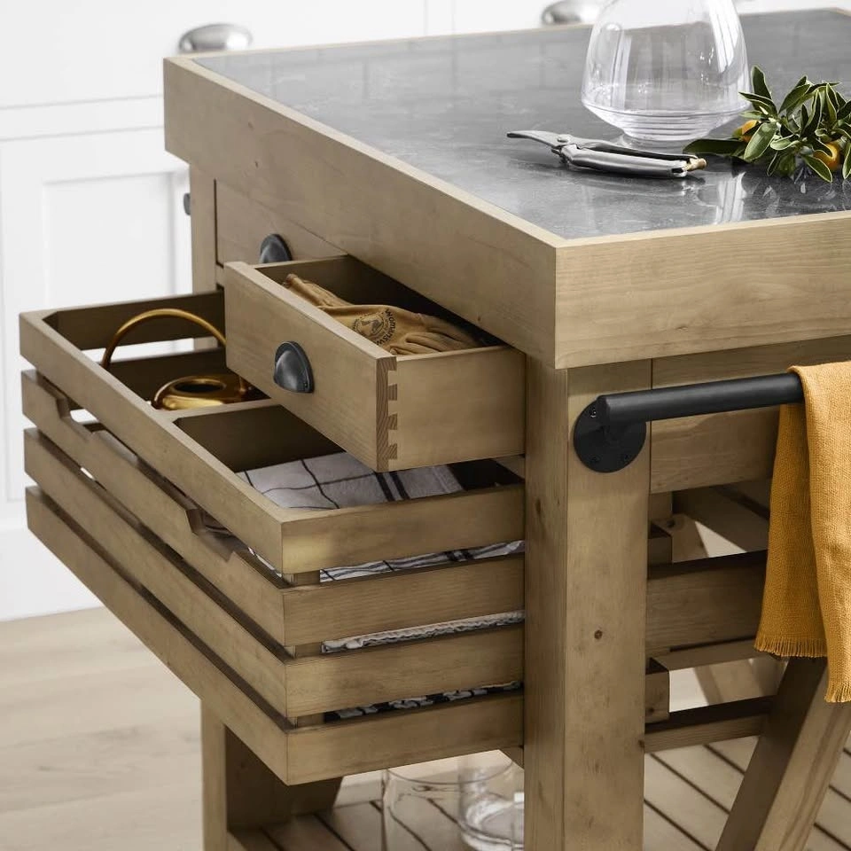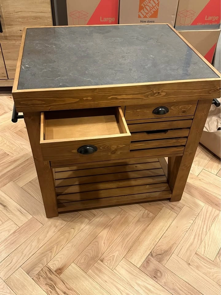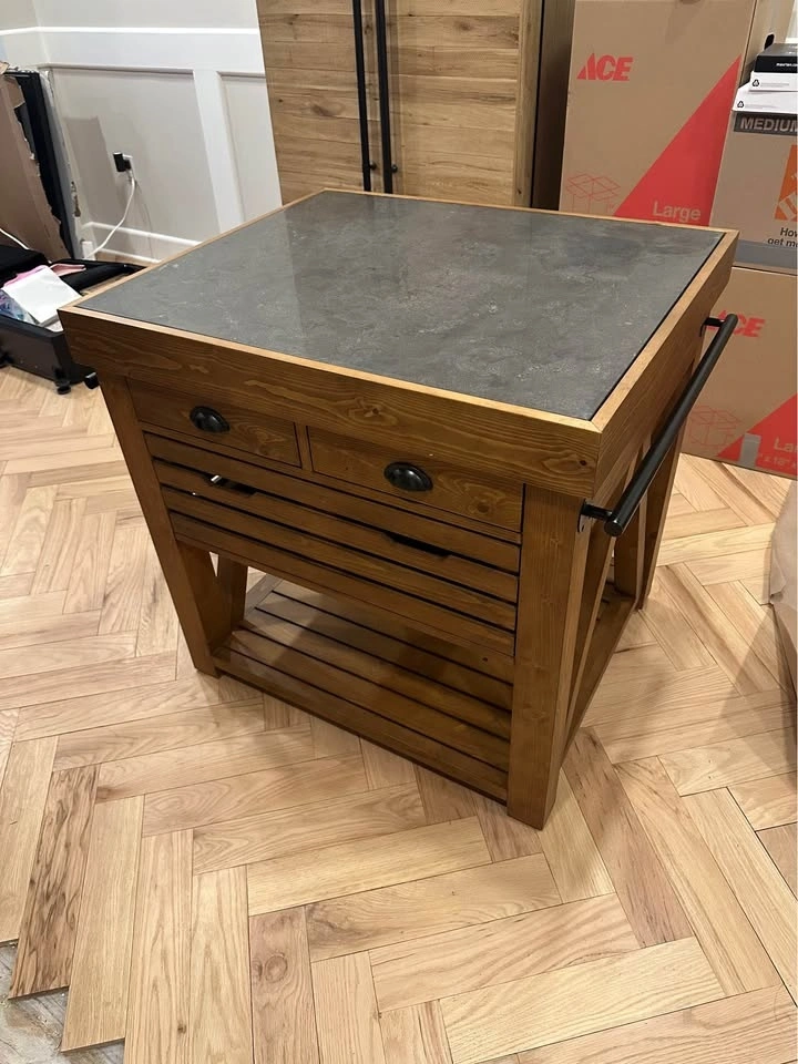 Like new condition purchased directly from William Sonoma and retails for $3,295 (before tax/shipping). Handcrafted island has a limestone solid top which can be removed for cleaning. Creates a beautiful, functional focal point for the kitchen. Open shelves and drawers on both sides offer ample storage for everything from prep tools to cutlery and dinnerware. Eight small drawers, four large drawers, open slatted shelf and two towel bars are accessible from either side.