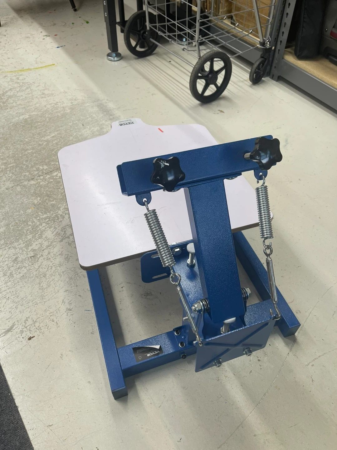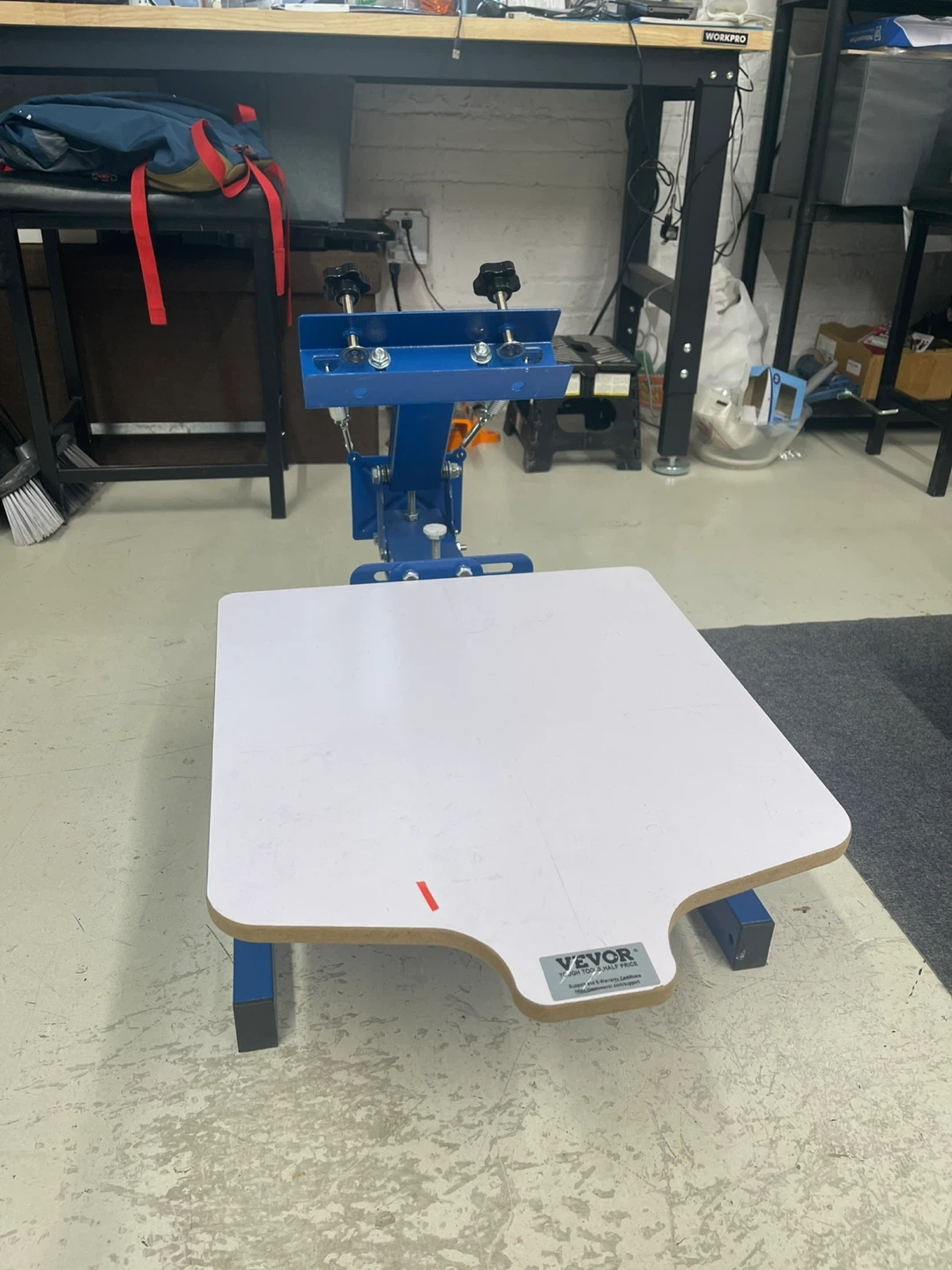 This is a VEVOR screen printing pallet clamp for garment printing. It features a durable blue metal frame and a white printing surface. The adjustable clamp ensures secure screen placement for various printing projects.