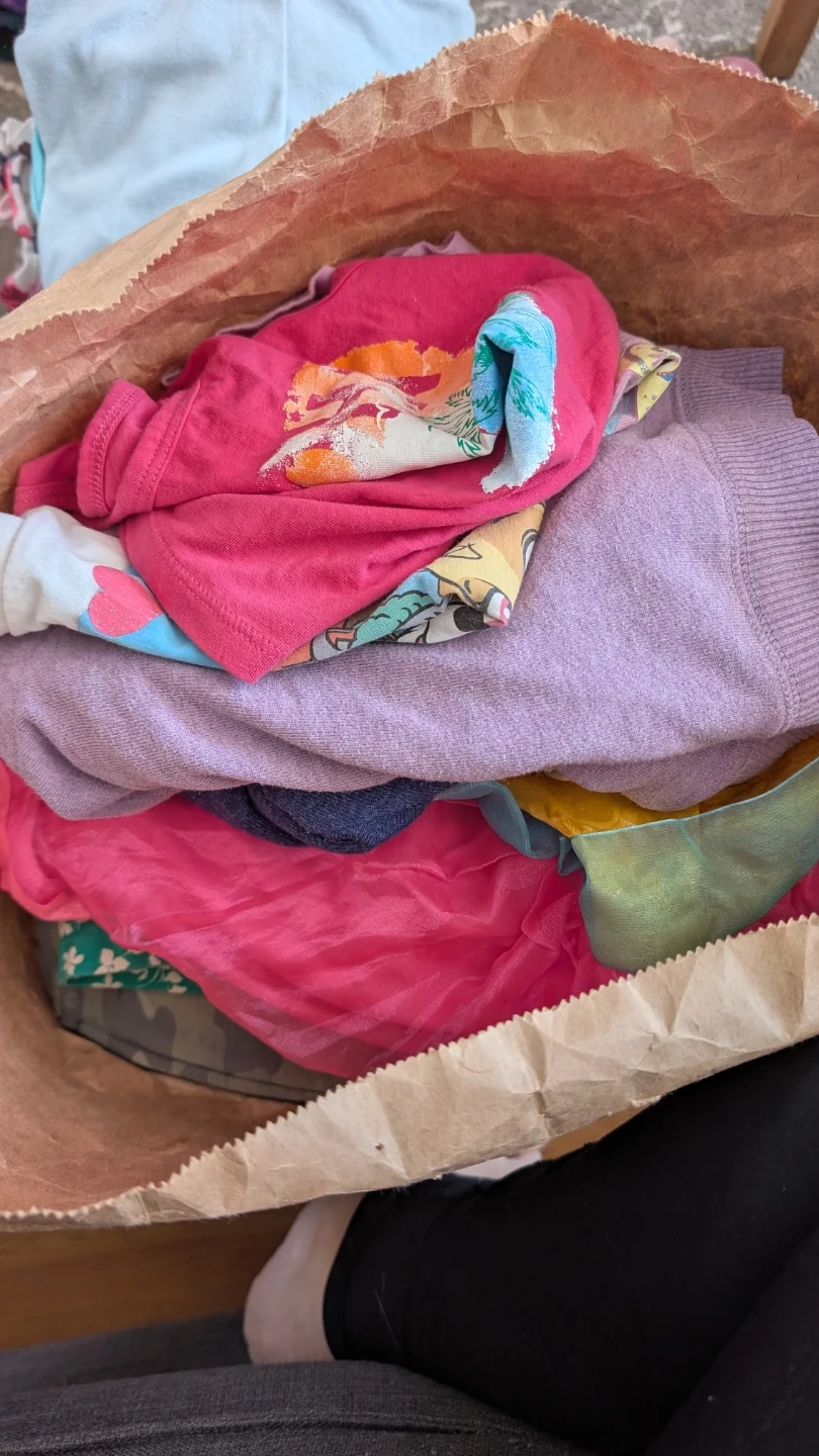 A bundle of various kids' clothing items. Includes tops and a sweater. Assorted colours like pink, purple, and blue are visible. Materials and sizes vary.