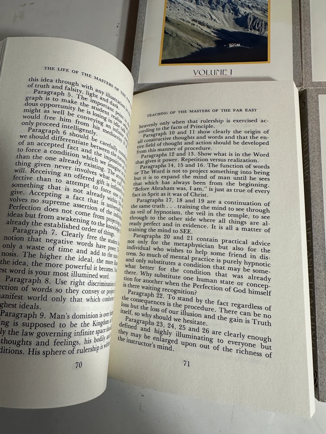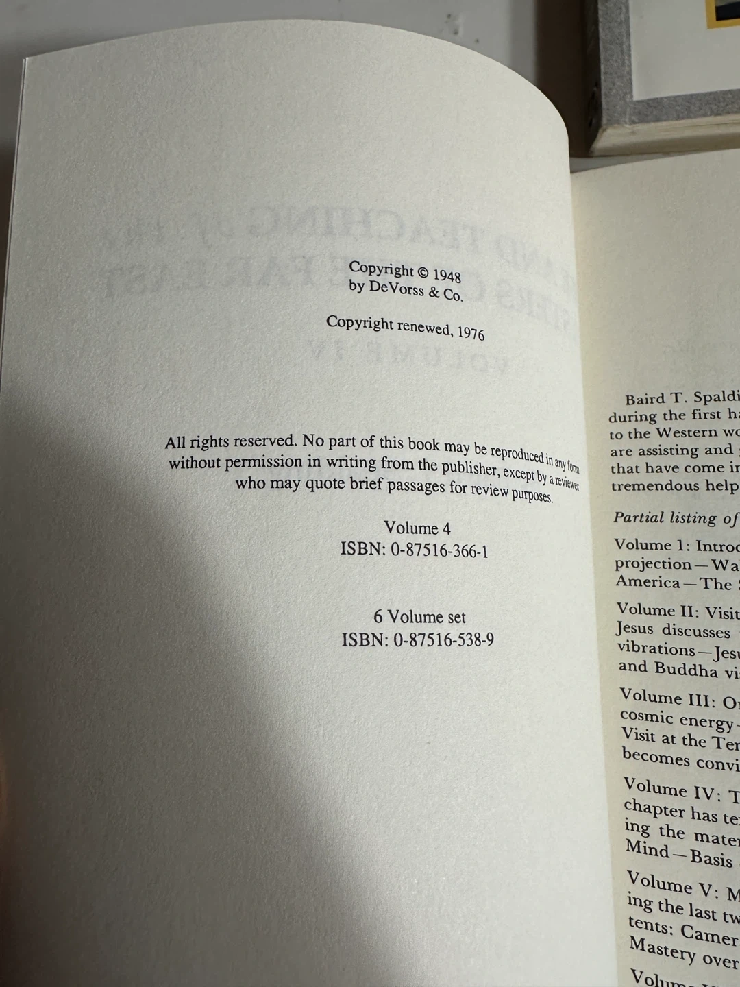 This is a 6 volume set of Baird T. Spalding's Life and Teaching of the Masters of the Far East. The copyright is from 1948 and renewed in 1976. This set includes volumes 1 through 6.