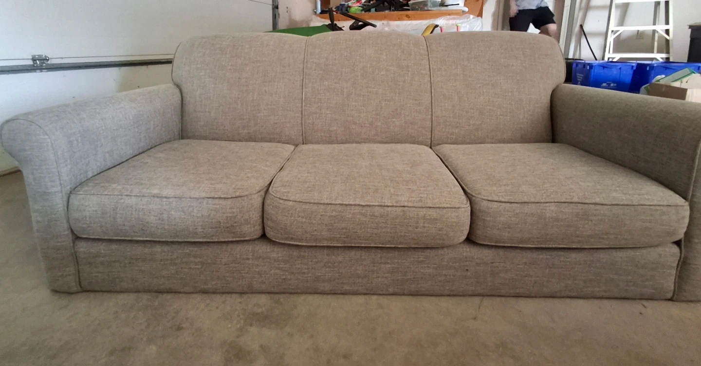 Selling a comfortable three-seater sofa. It features a neutral linen fabric that would fit well with any decor. Perfect for a living room or den!