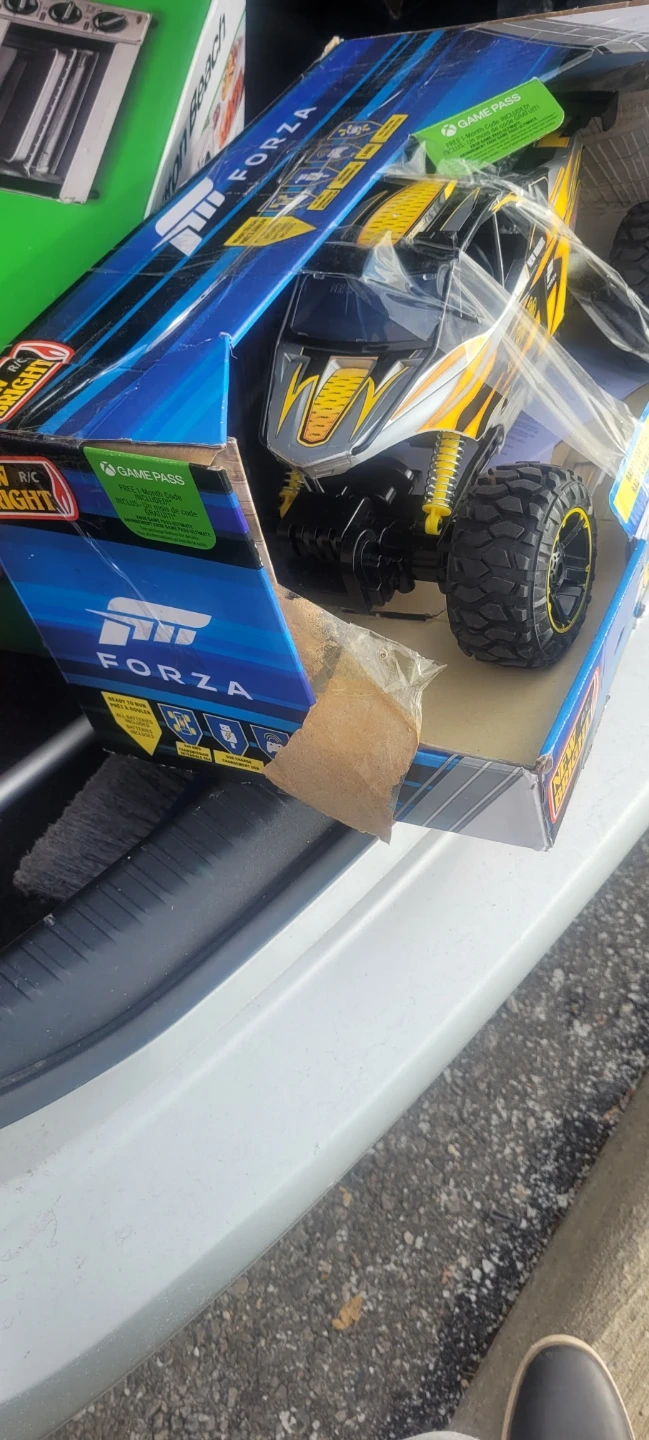 This is a New Bright Forza RC monster truck in yellow and black. It's designed for off-road fun. Great for kids who love remote-controlled vehicles!