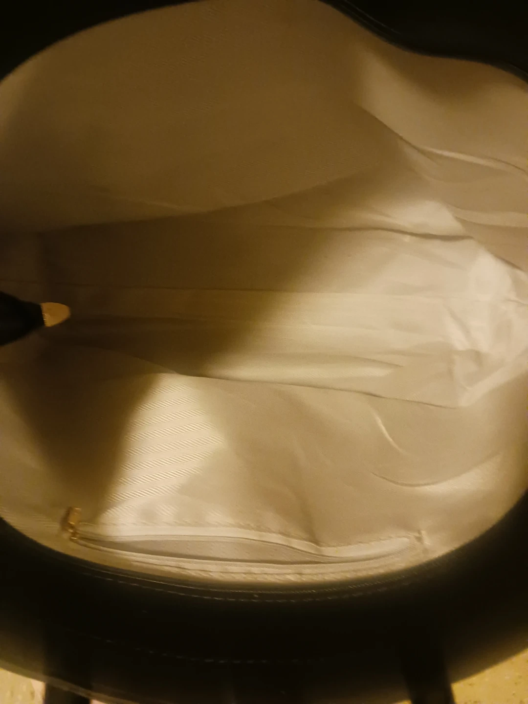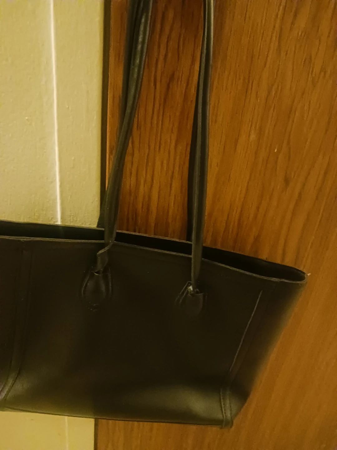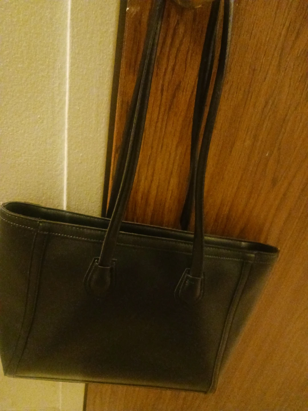 This is a classic black leather tote bag. It has a spacious interior with a zippered pocket. Leather exterior with fabric lining. Never used