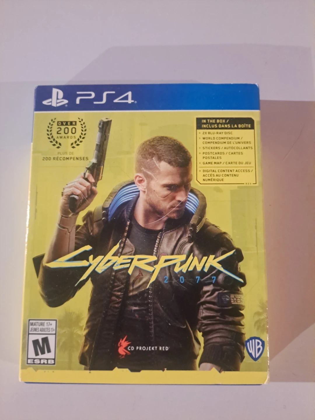 This is the PS4 version of Cyberpunk 2077. It comes with two Blu-ray discs, a world compendium, stickers, postcards, and a game map. Digital content access is also included.