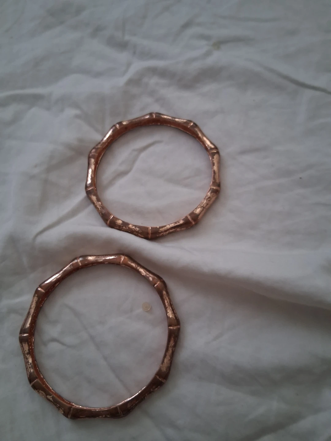 This listing is for a set of two bangles with a bamboo-inspired design. They have a rose gold tone finish. These bracelets are perfect for adding a unique accent to your outfit!