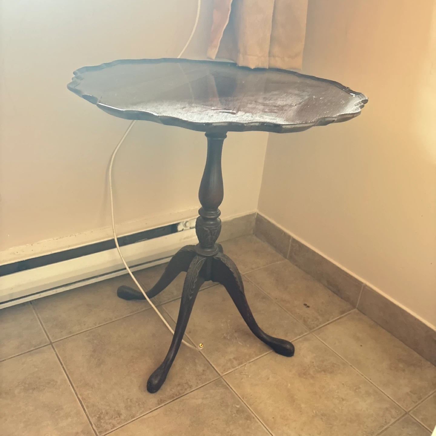 This is a charming antique wooden pedestal table with a carved base. Its scalloped edge top adds a decorative touch. It's a beautiful accent piece for any room.