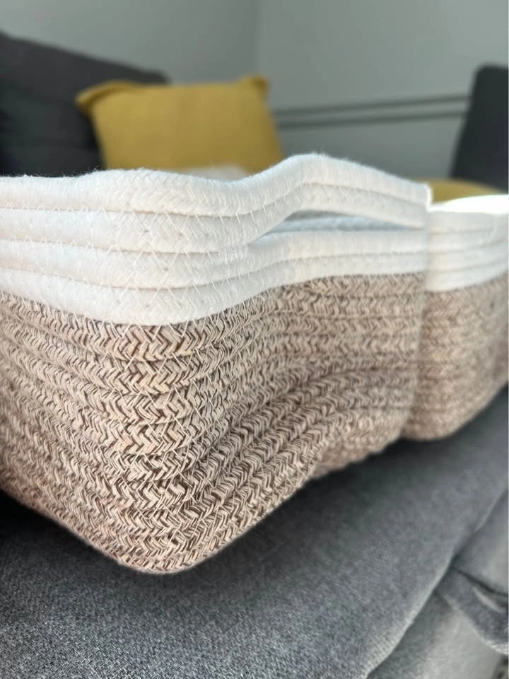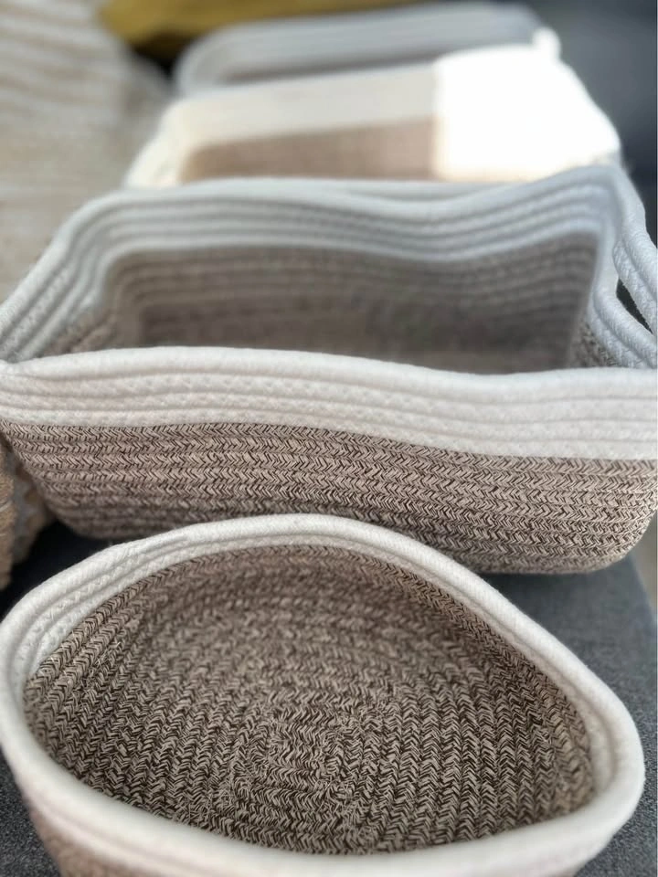 Brand-new baskets. The size of the 3 biggest ones: 29cm x 20.5cm x 14cm, 28cm x 19cm x 14cm (2 are the same size). The 2 smallest round ones are 17.5cm in diameter and 7.5cm in height. Cash only.