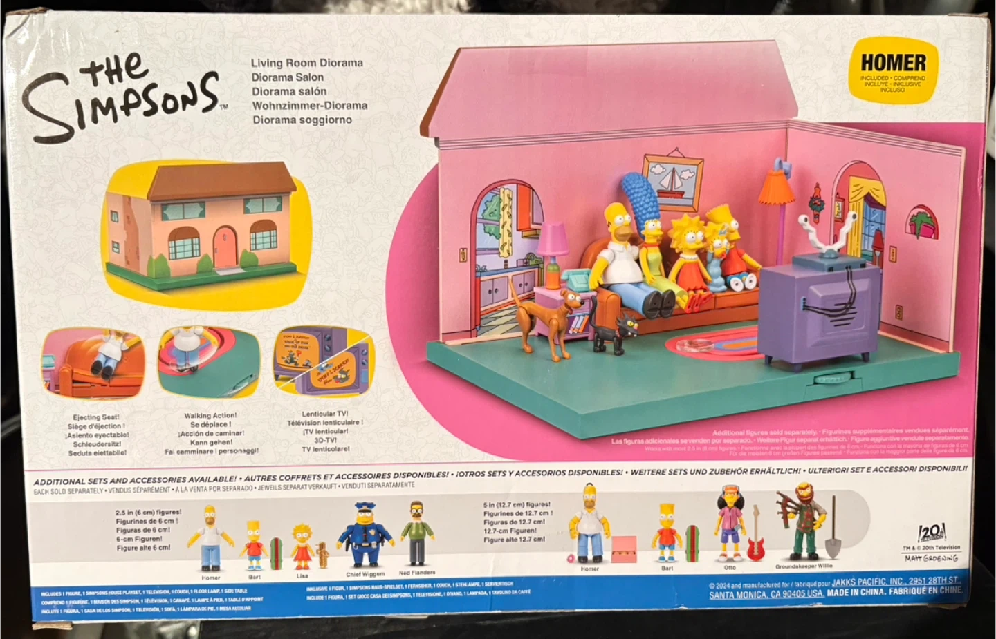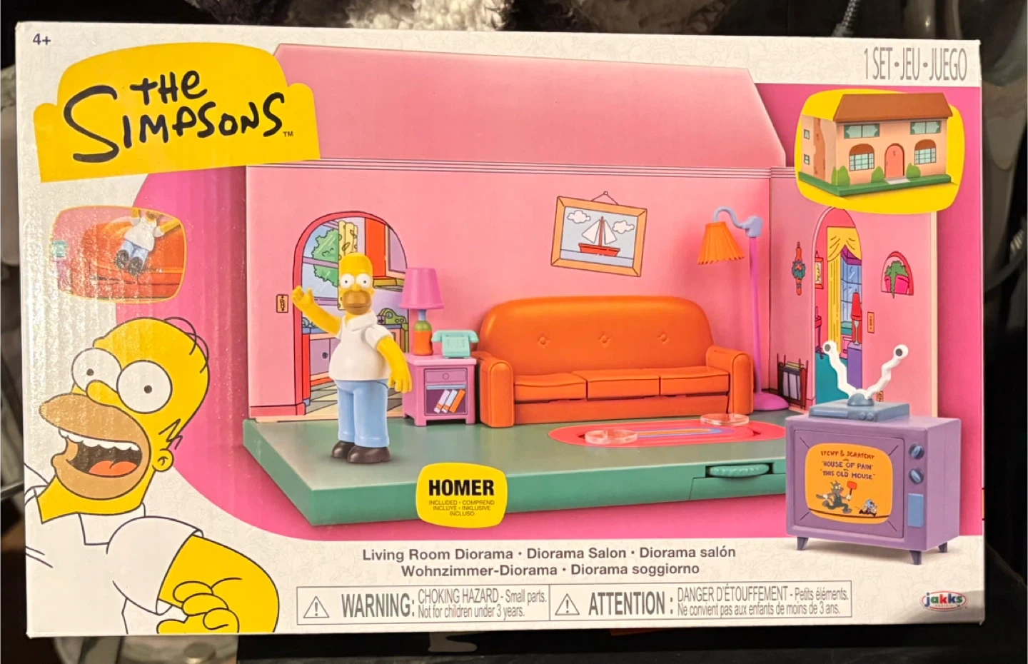 This is The Simpsons Living Room Diorama playset featuring Homer Simpson. It's perfect for fans of the show. Included are additional sets and figures sold separately.