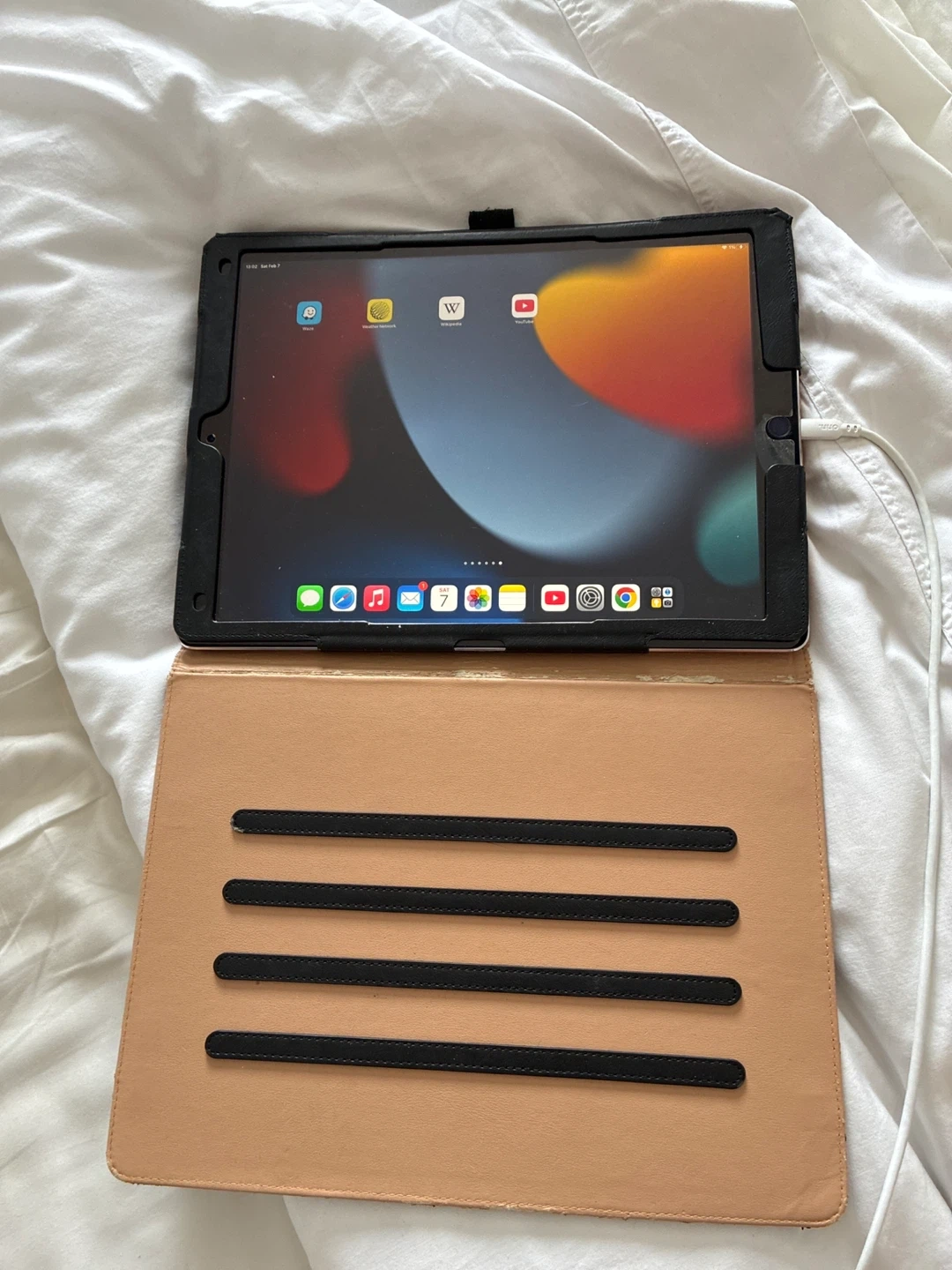 This is a 12.9-inch iPad Pro with 128 GB of storage. It's running iPadOS 16.7.2. The device comes in a protective case. Charging cable is not included