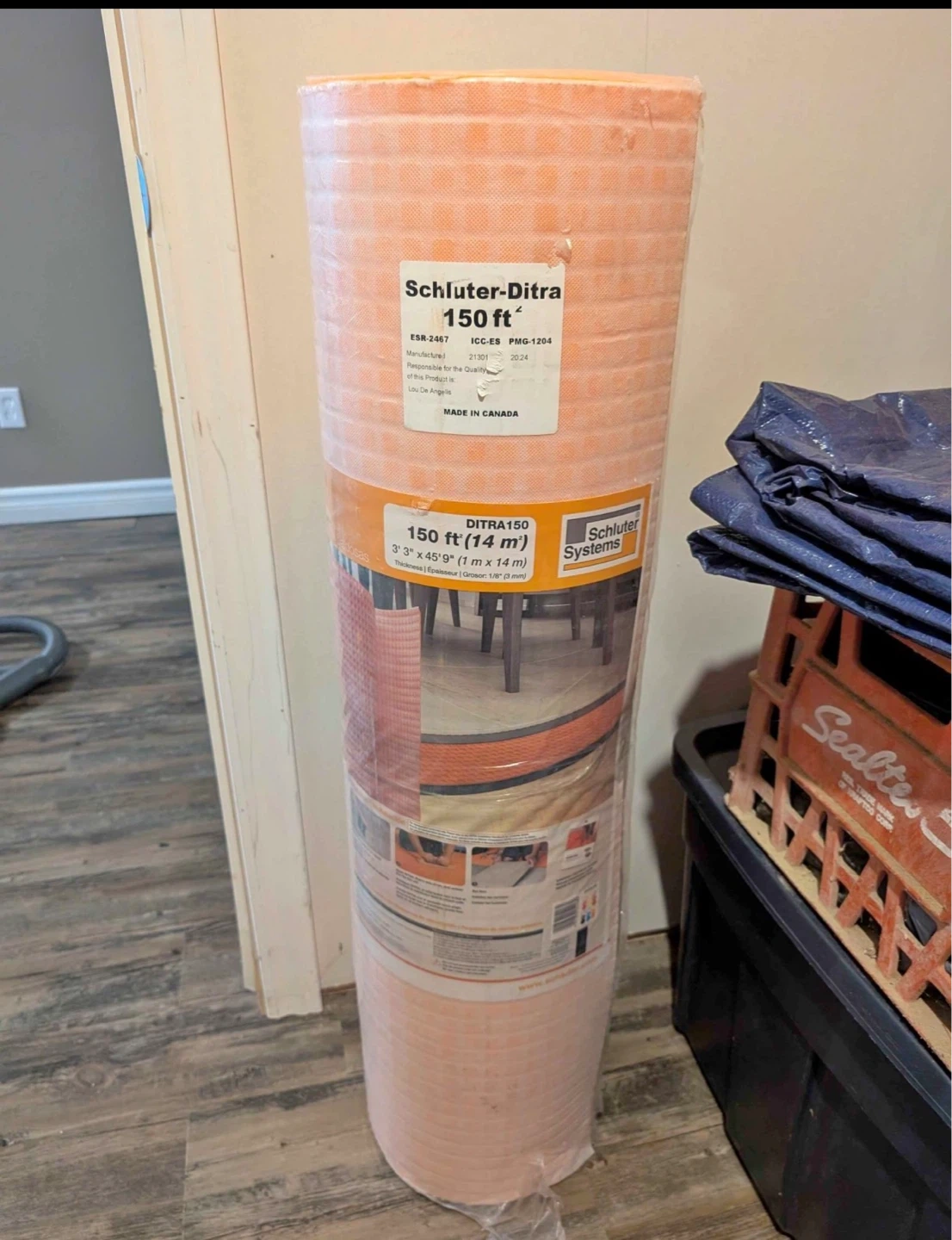 Schluter-Ditra 150 ft waterproofing membrane for tile installations. It's 3' 3" x 45' 9" (1m x 14 m) with a thickness of 1/8" (3 mm).