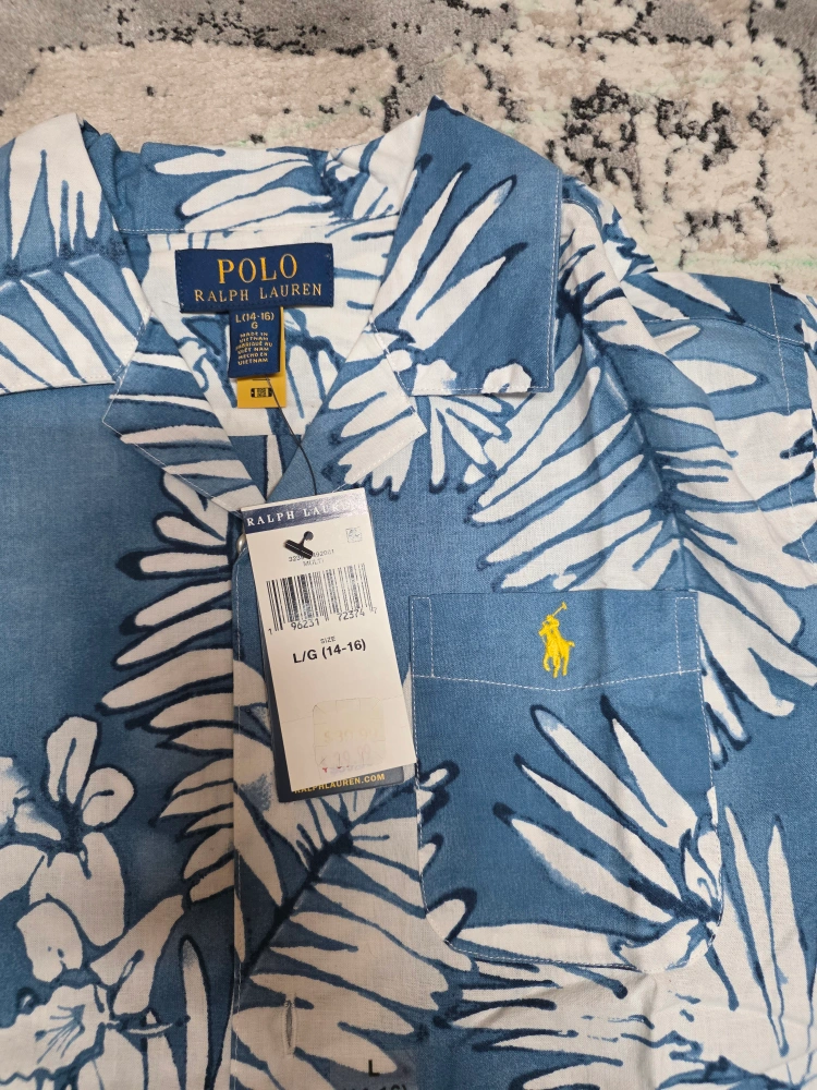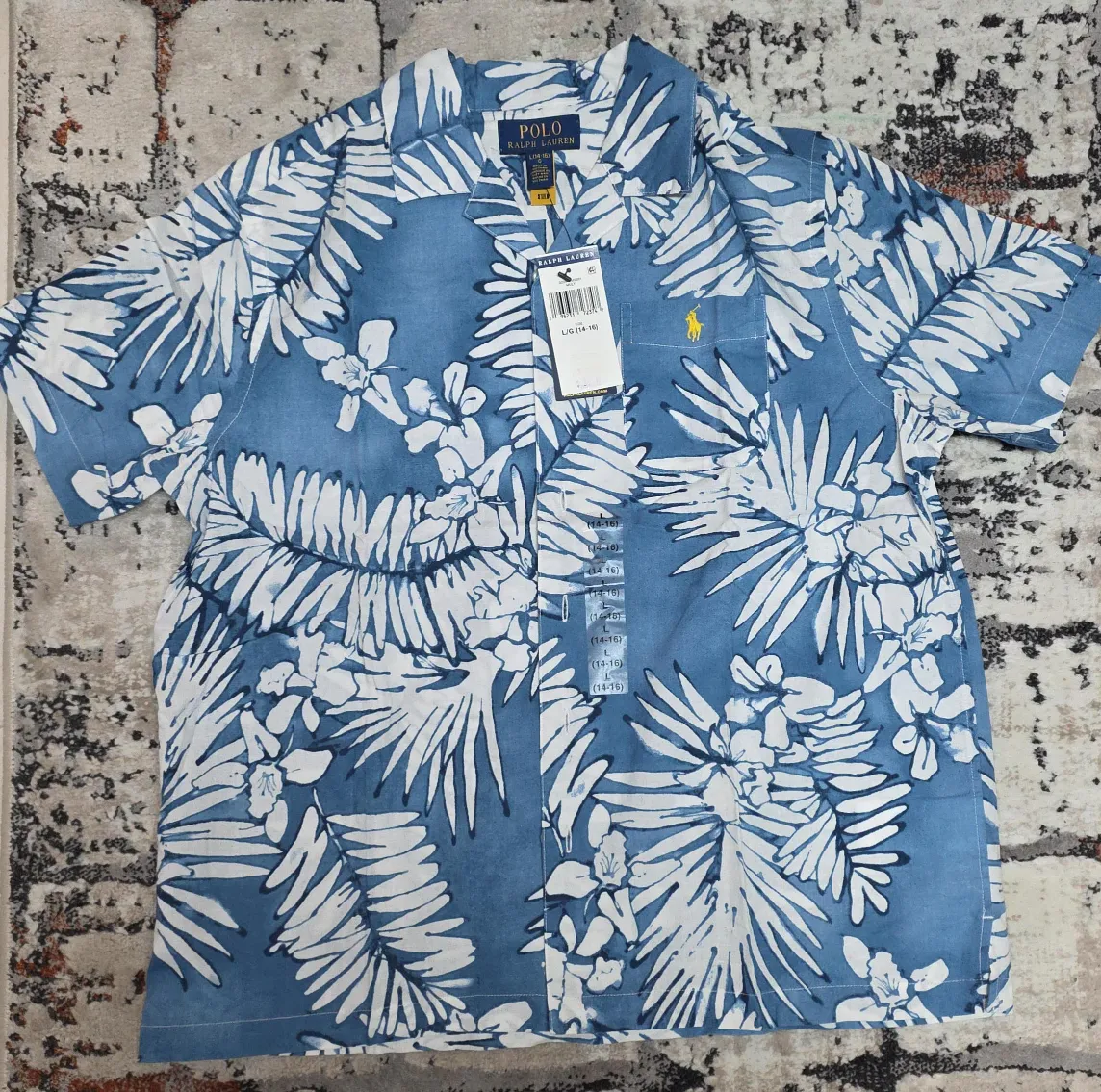 Polo Ralph Lauren short-sleeve button-up shirt with a blue and white floral print. Size L (14-16). Not worn at all. Its new with tags still on it.