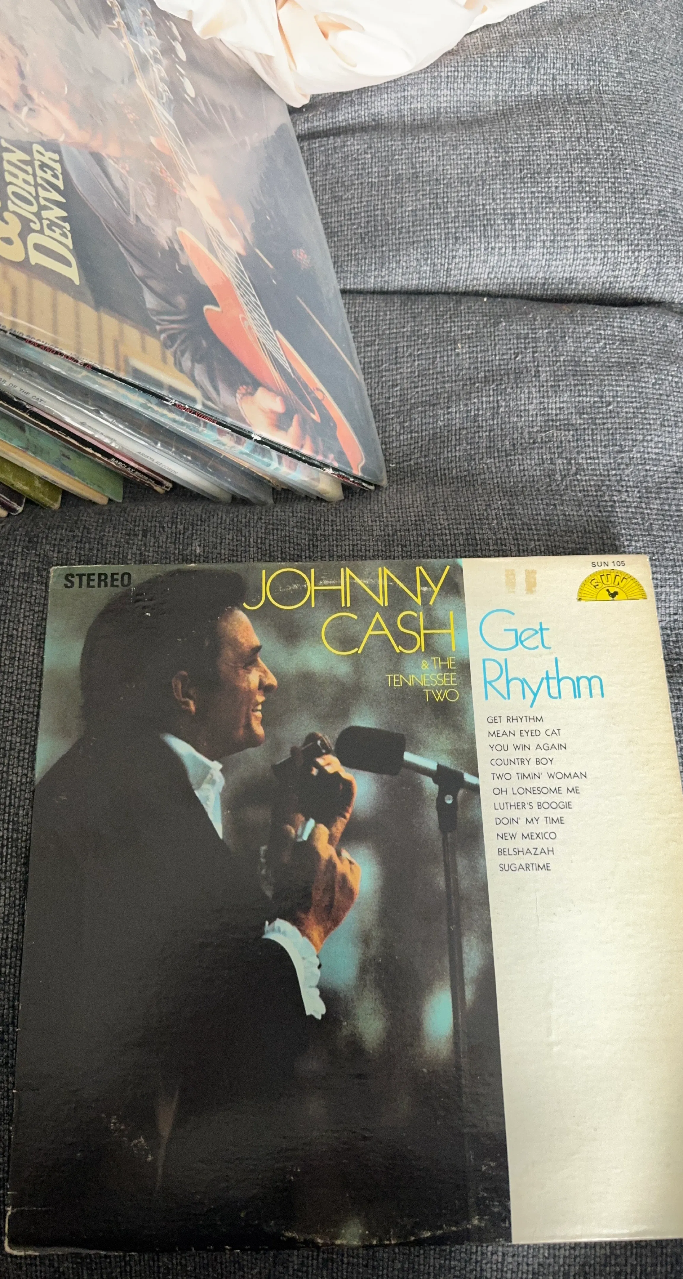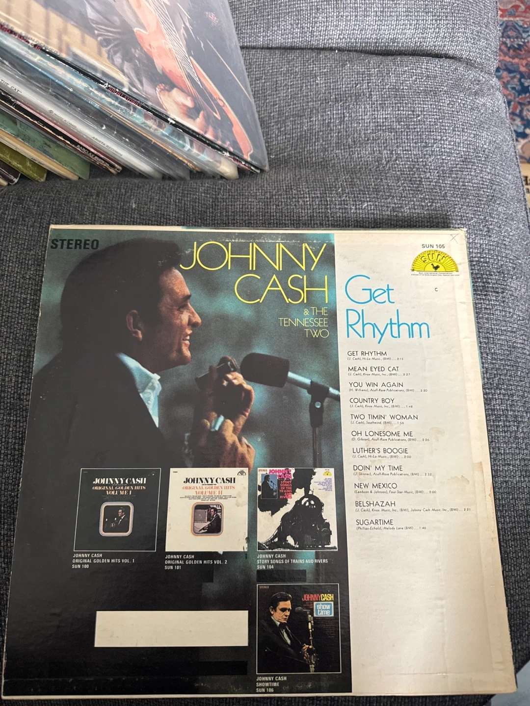 Classic vinyl record featuring Johnny Cash & The Tennessee Two. Album titled 'Get Rhythm'. Includes tracks like 'Mean Eyed Cat' and 'Country Boy'.