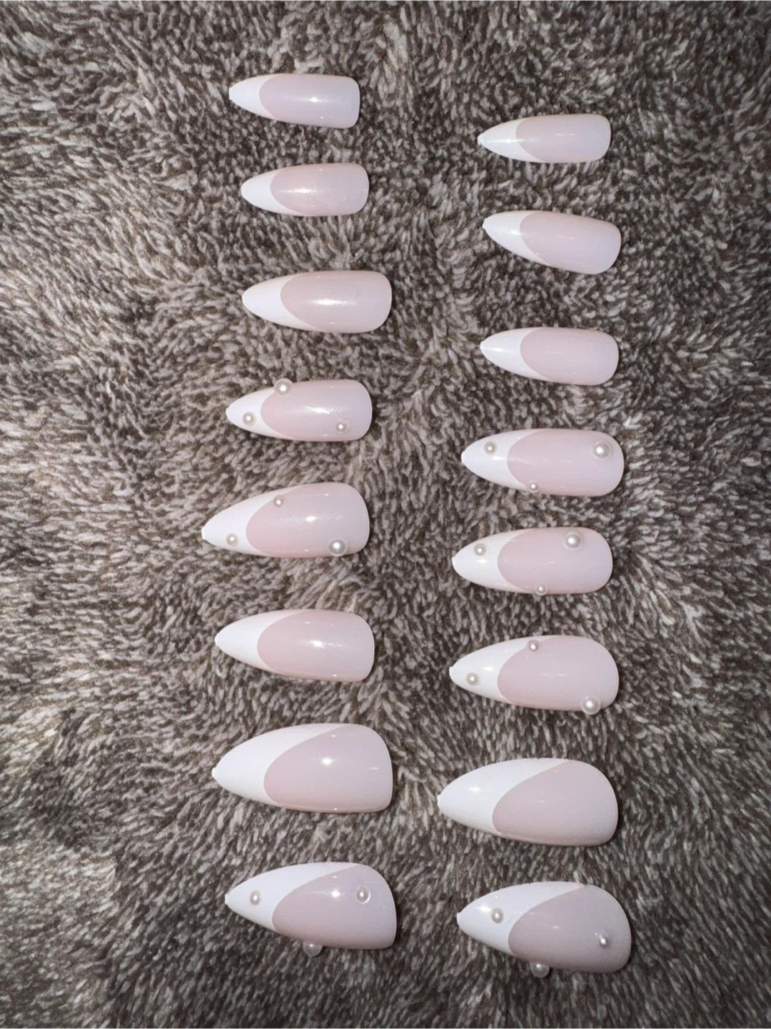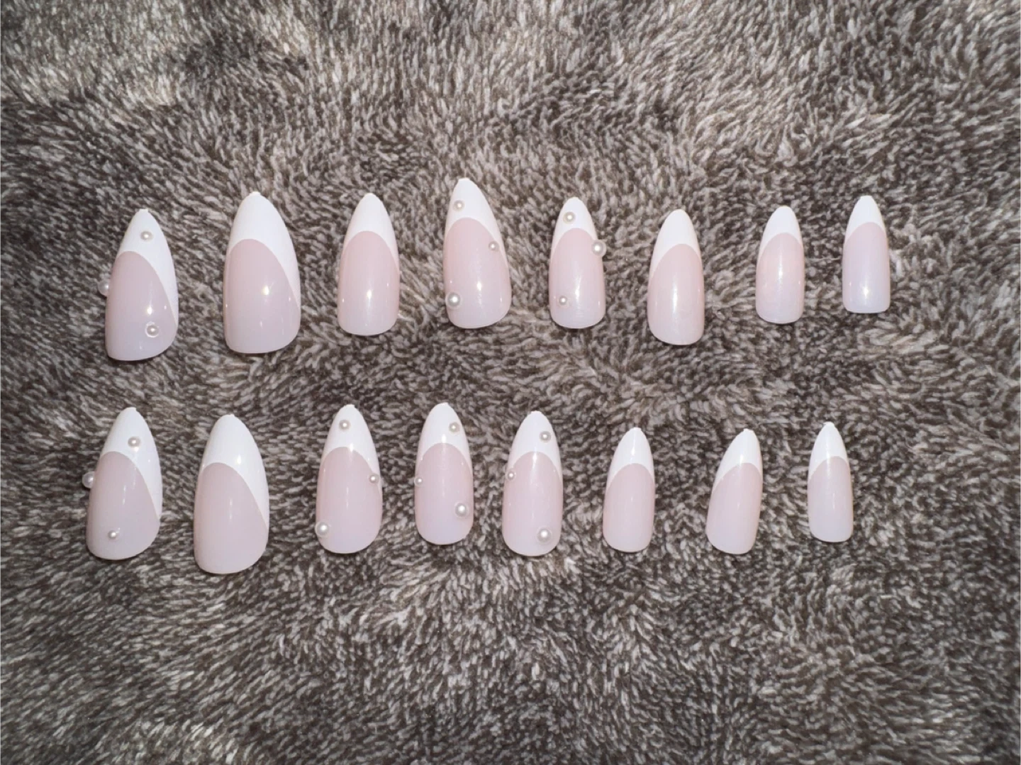 A set of 12 French tip press-on nails decorated with small pearls. These nails come in a stiletto shape with a white tip and a light pink base. They're great for a quick, polished look. Suitable for special occasions or everyday wear!