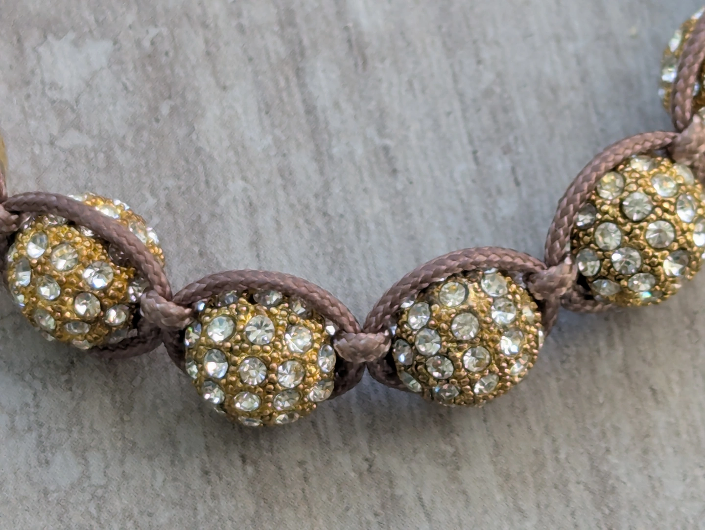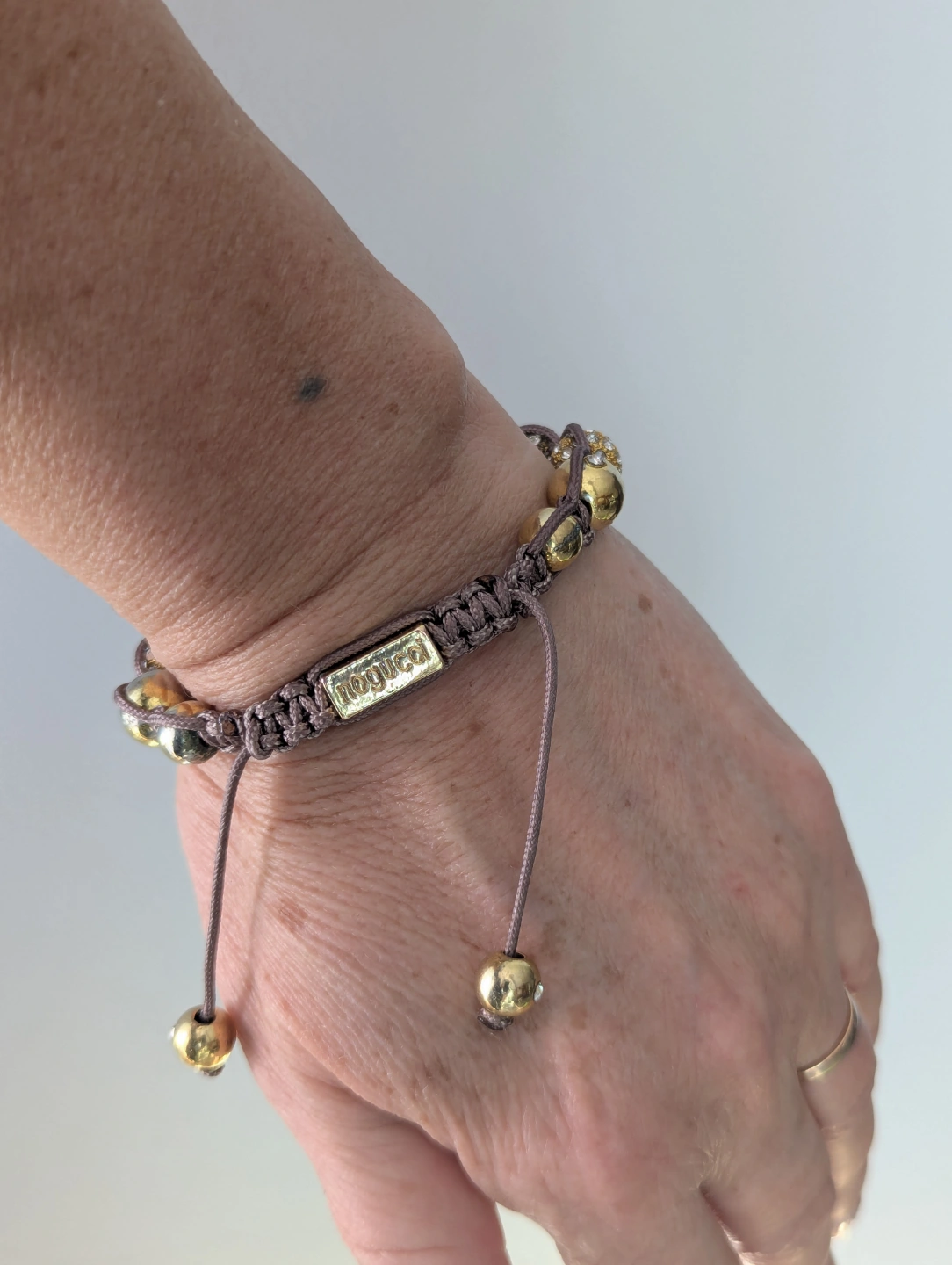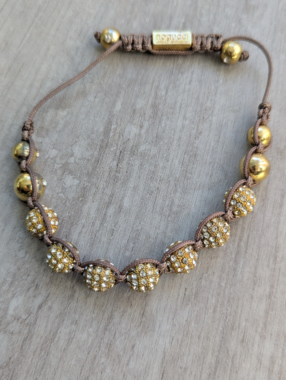 Gorgeous Nogucci bracelet. Features a taupe cord, gold-toned beads, and crystal-encrusted spheres. Adjustable length. Beautiful statement piece.
