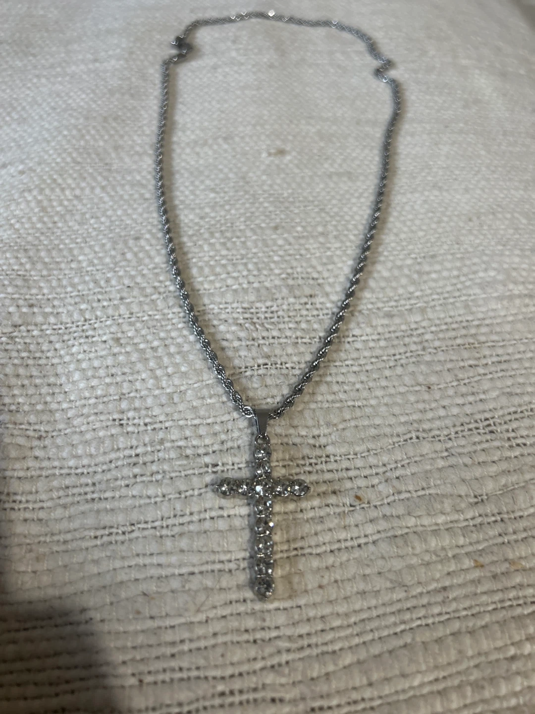 A stylish men's necklace featuring a cross pendant with sparkling stones. The rope chain is durable and measures 22 inches. It's a statement piece for everyday wear.