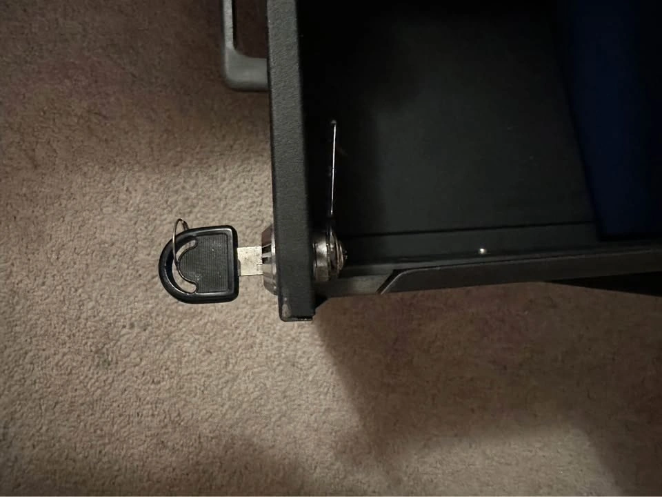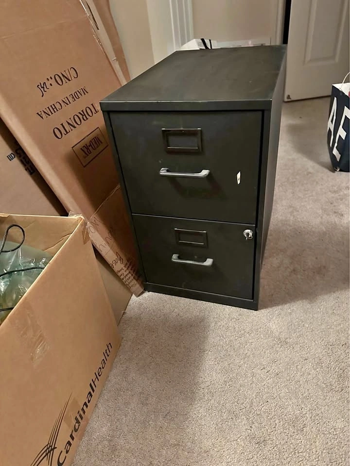 Sturdy black two-drawer filing cabinet. Has a lock and comes with key. Good for keeping documents organized at home or office. The lock works, but it is loose.