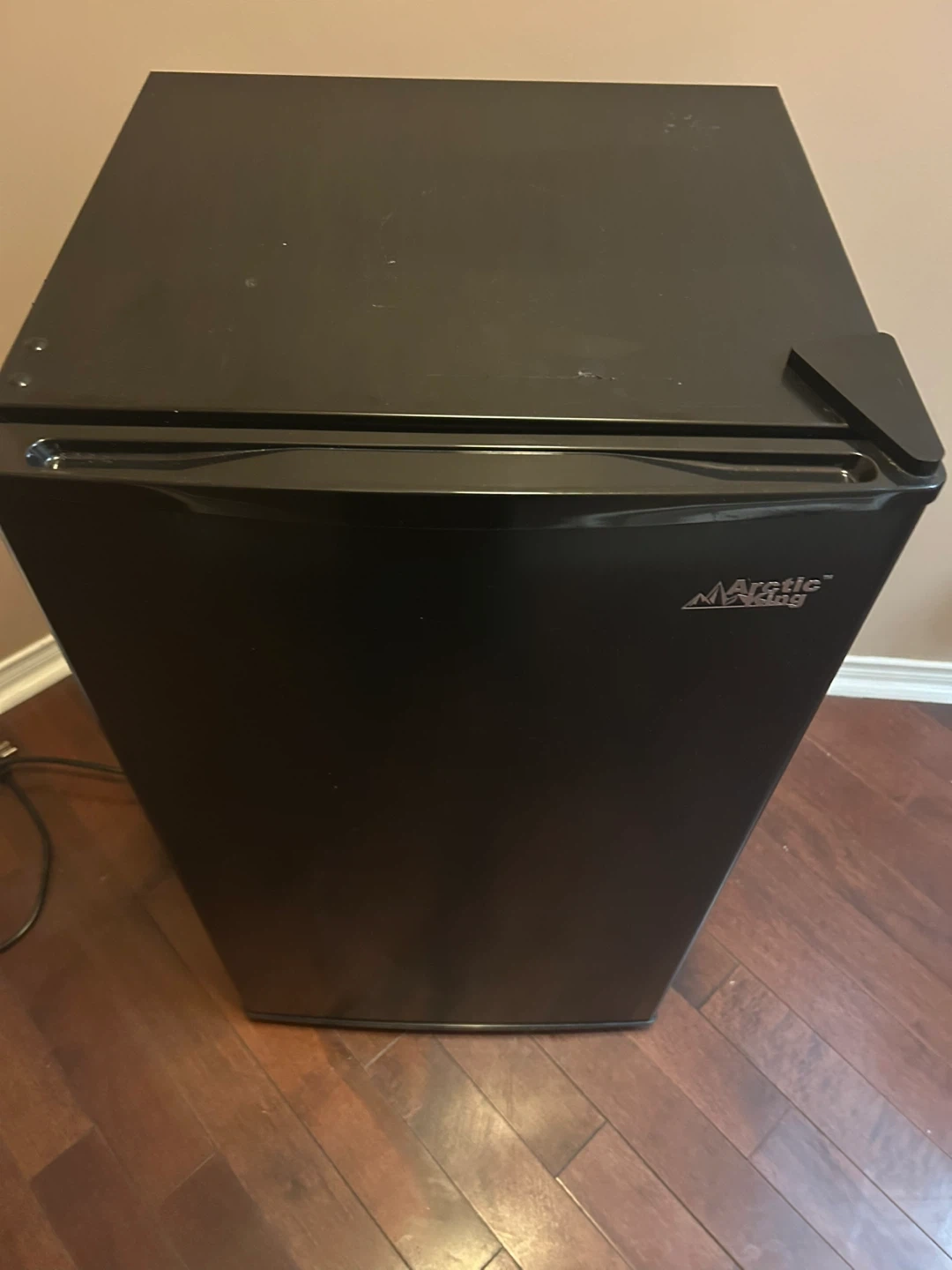 Black Arctic King mini fridge. It's a compact appliance perfect for keeping drinks and snacks cool. The exterior is black, and it has a reversible door.