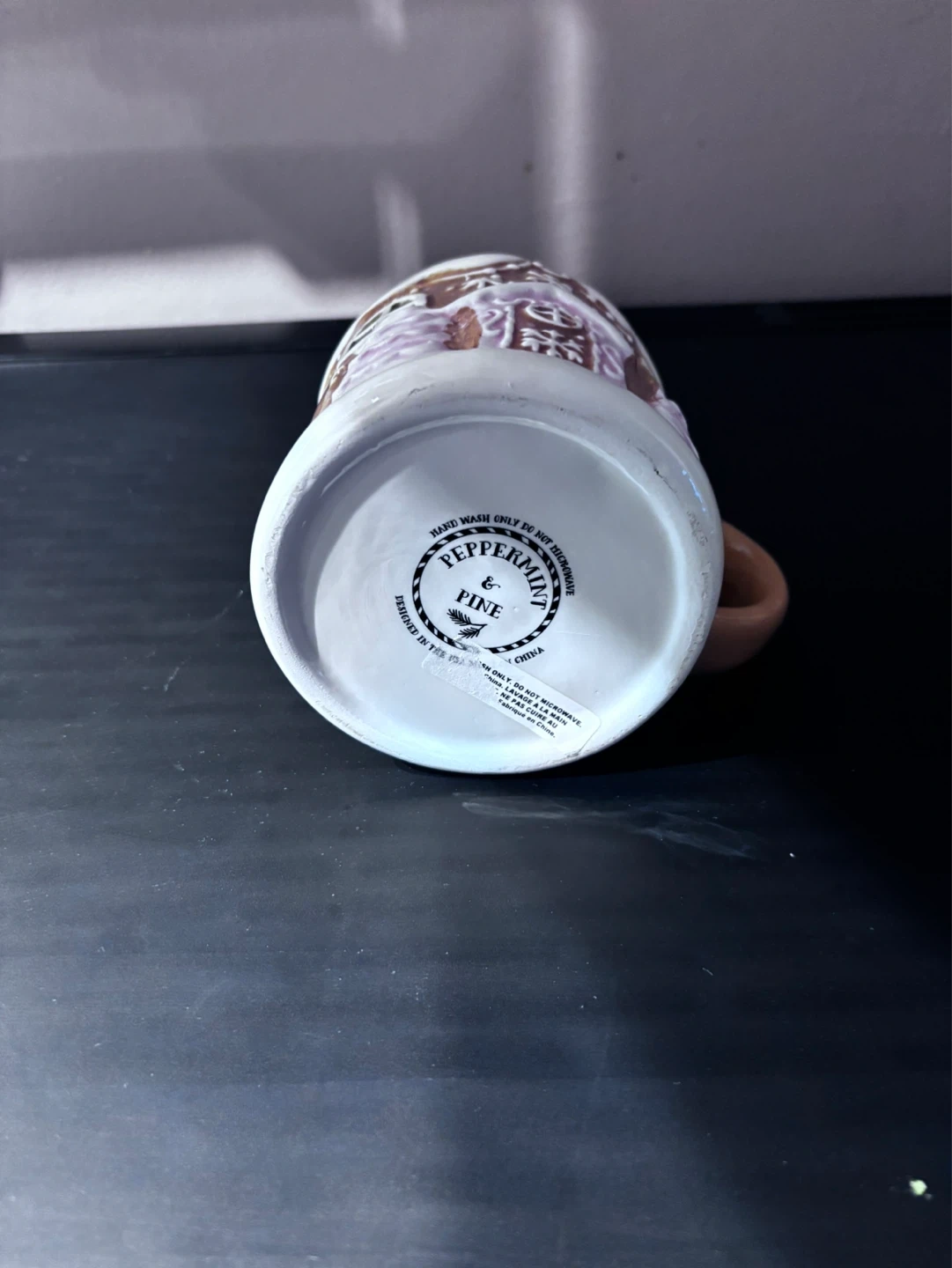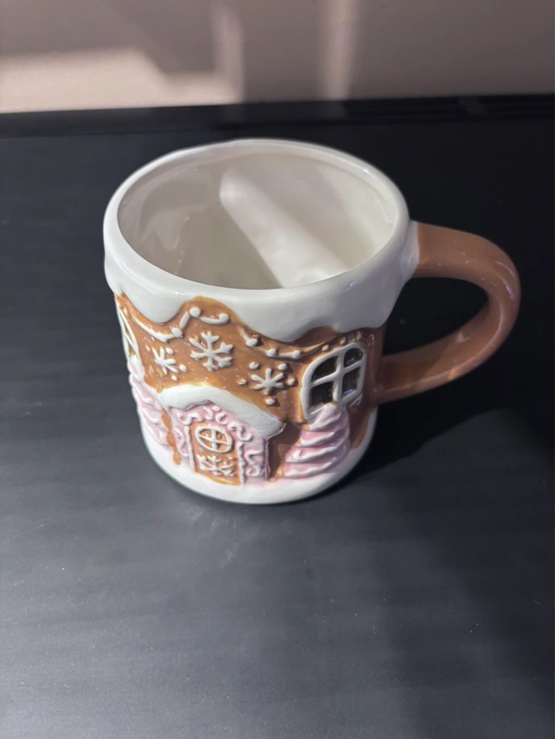 Festive ceramic mug featuring a gingerbread house design. Perfect for enjoying a warm drink during the holidays. Hand wash only; not microwave safe.