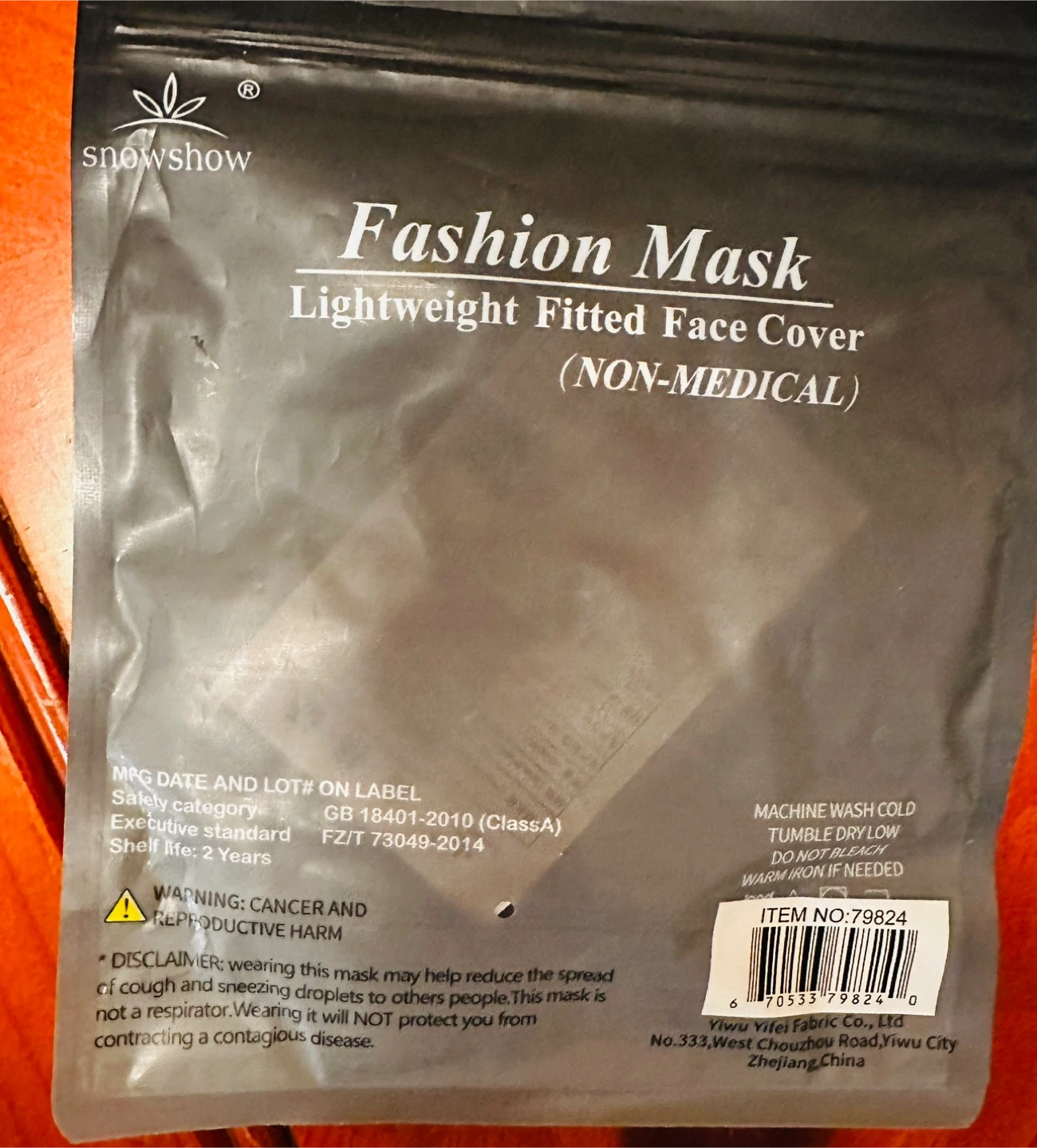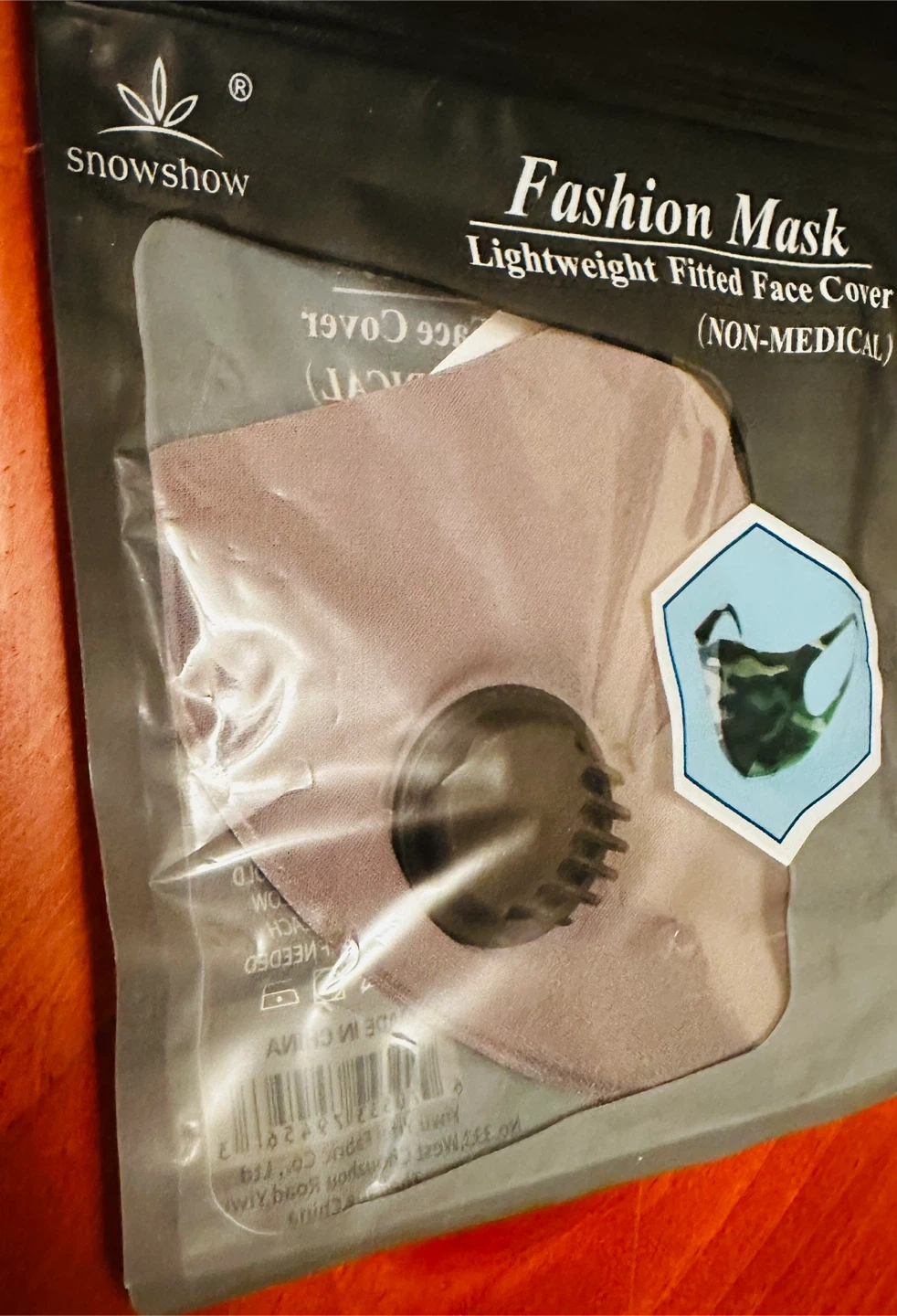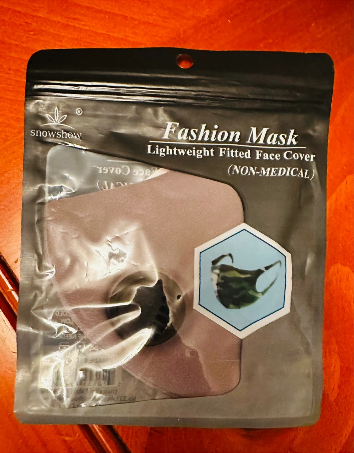 This is a Snowshow fashion mask. It's a lightweight, fitted face cover. Non-medical use.