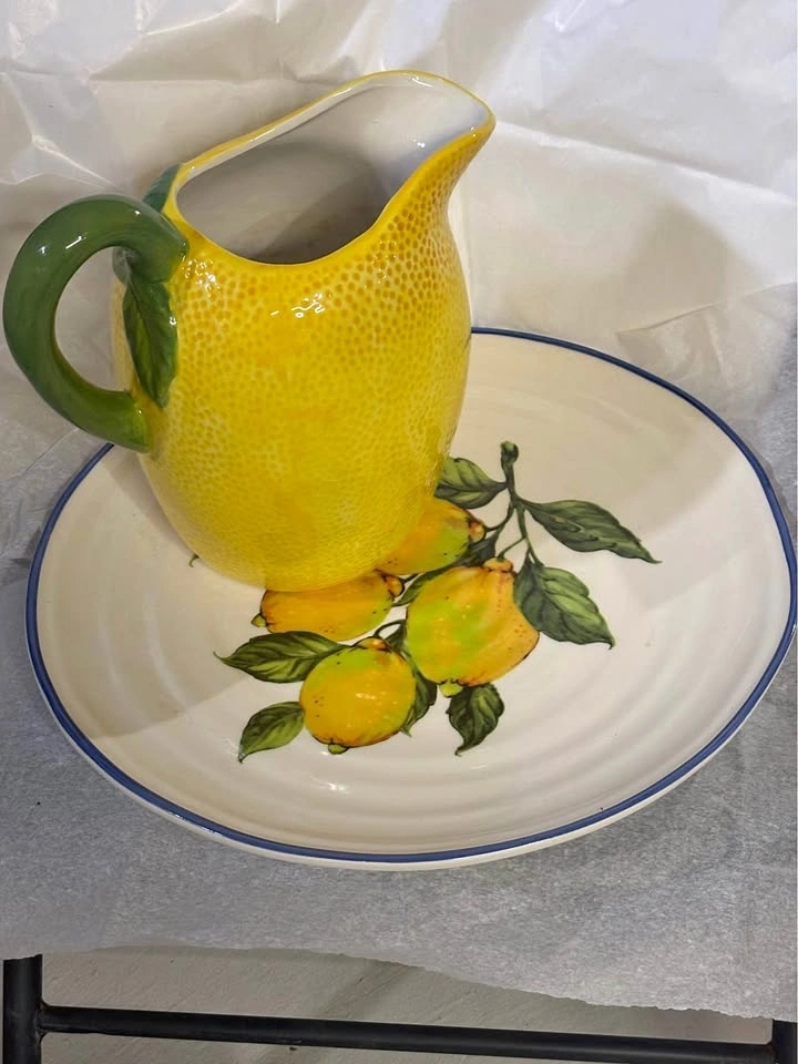 Beautiful pitcher and plate set with lemon design. Perfect for serving drinks, decor or summer table setting. Bright and stylish – great for kitchen or patio.