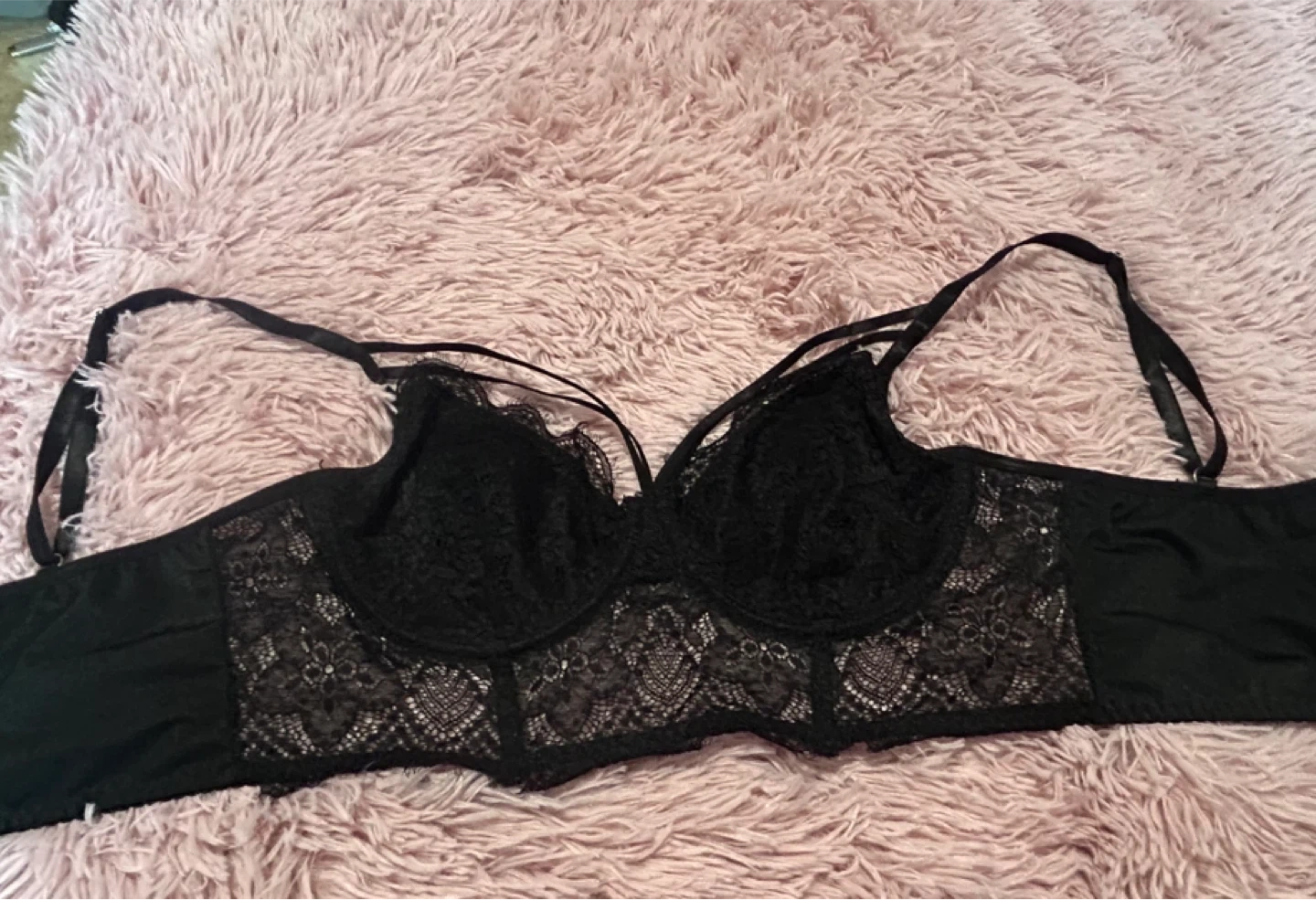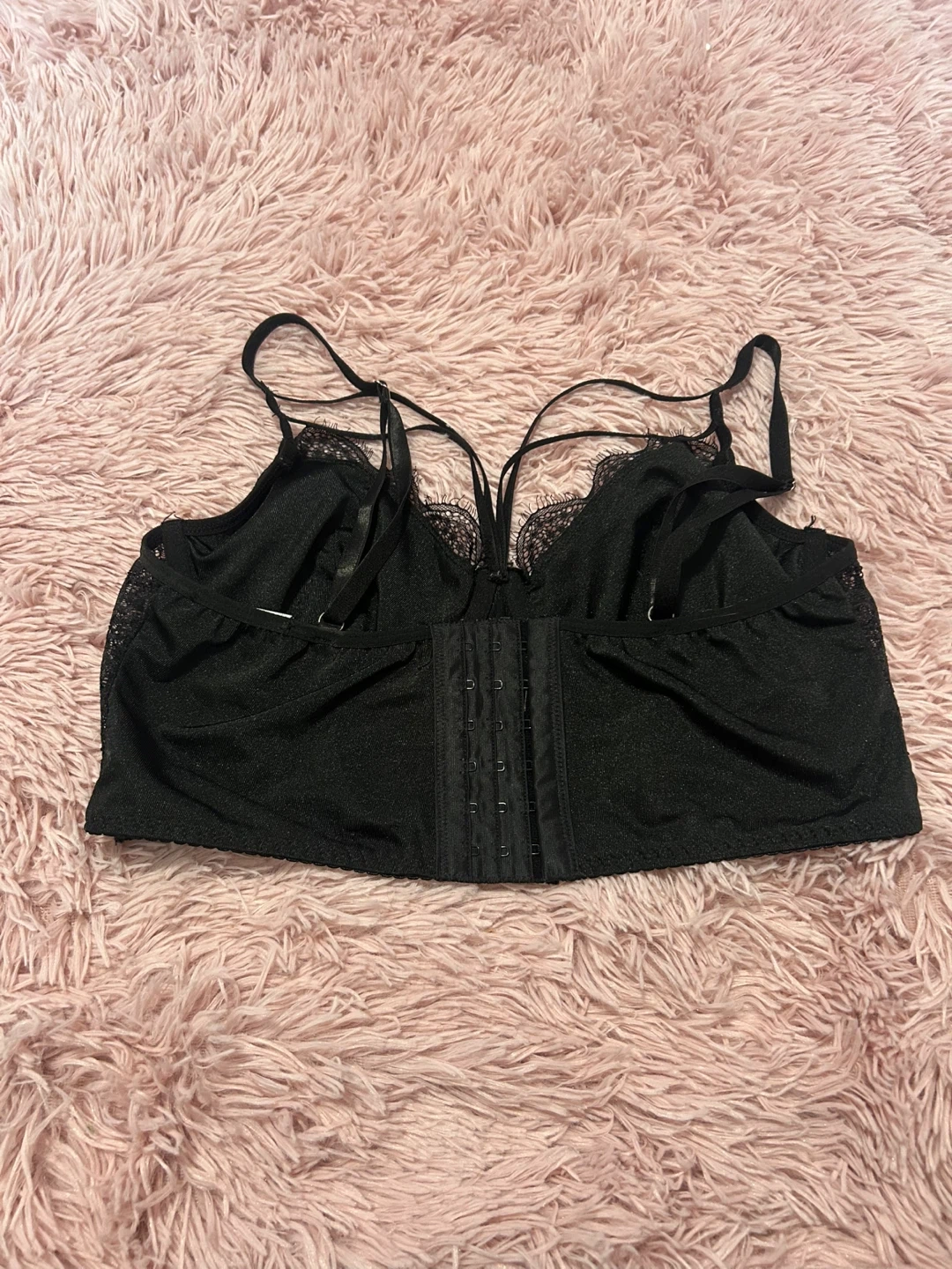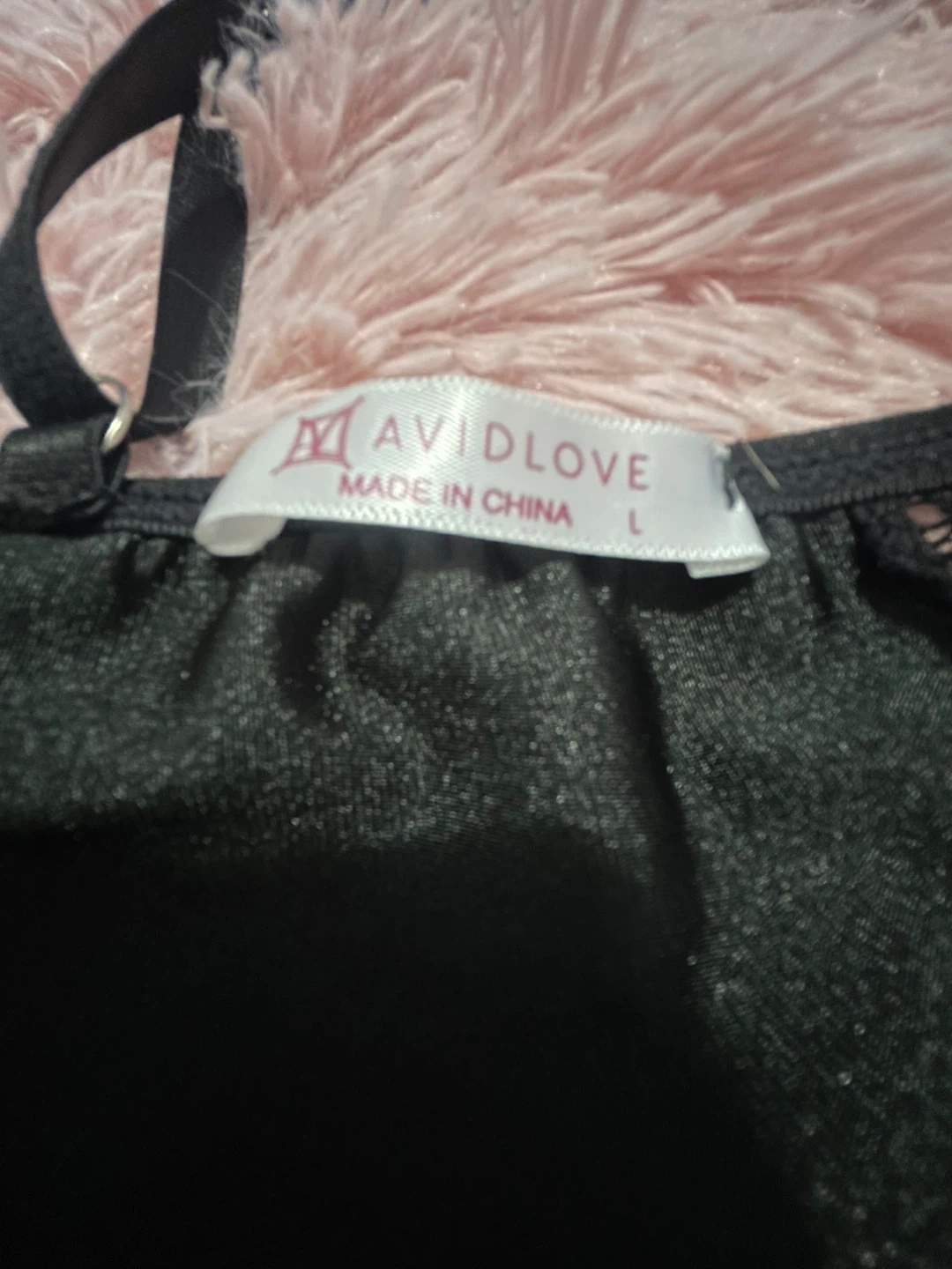 This is an AVIDLOVE black bra. It features intricate lace detailing and adjustable straps. The back has a hook-and-eye closure for a secure fit. It's a size large. Fits medium-large