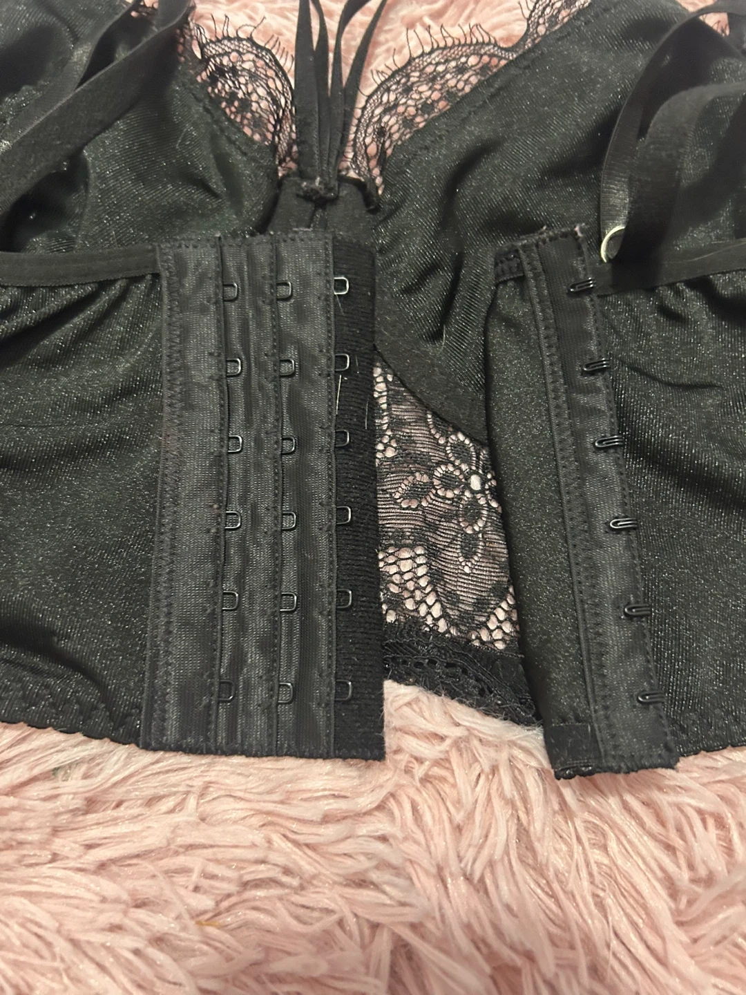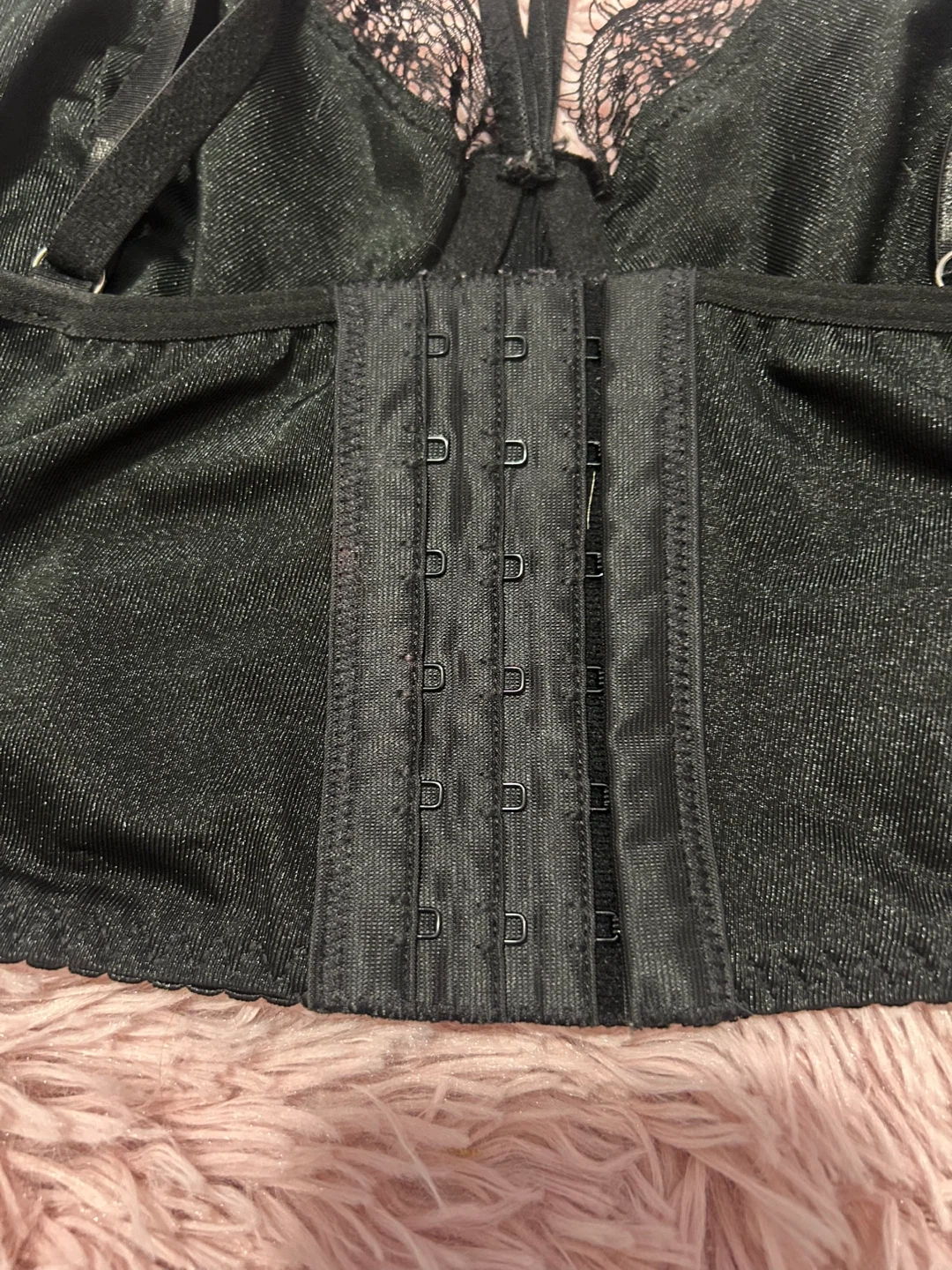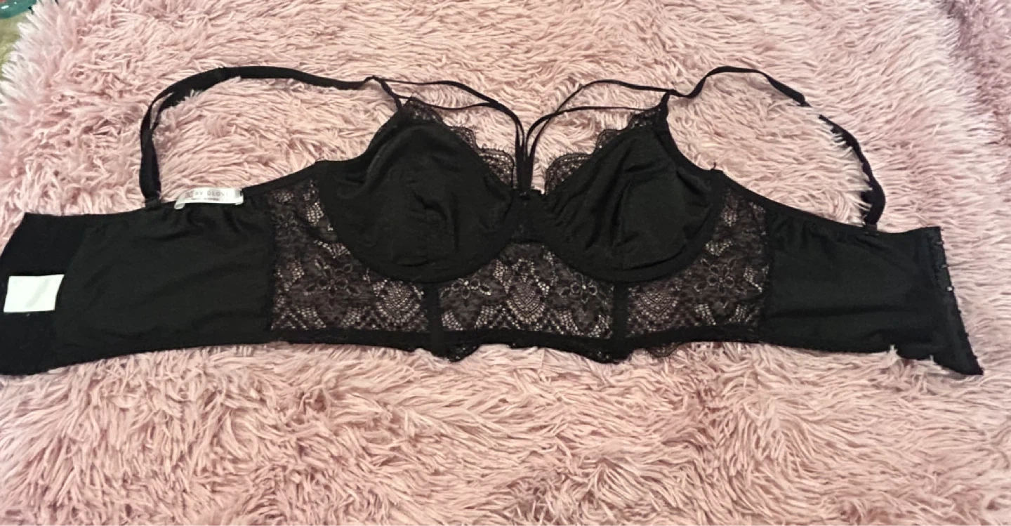 This is an AVIDLOVE black bra. It features intricate lace detailing and adjustable straps. The back has a hook-and-eye closure for a secure fit. It's a size large. Fits medium-large