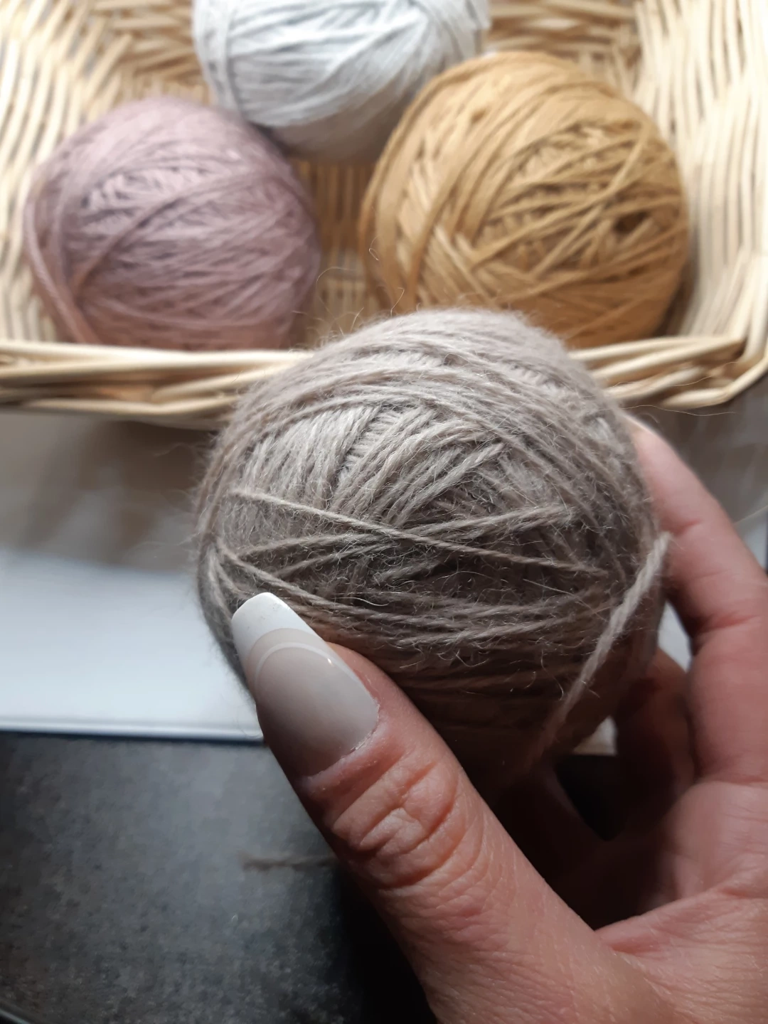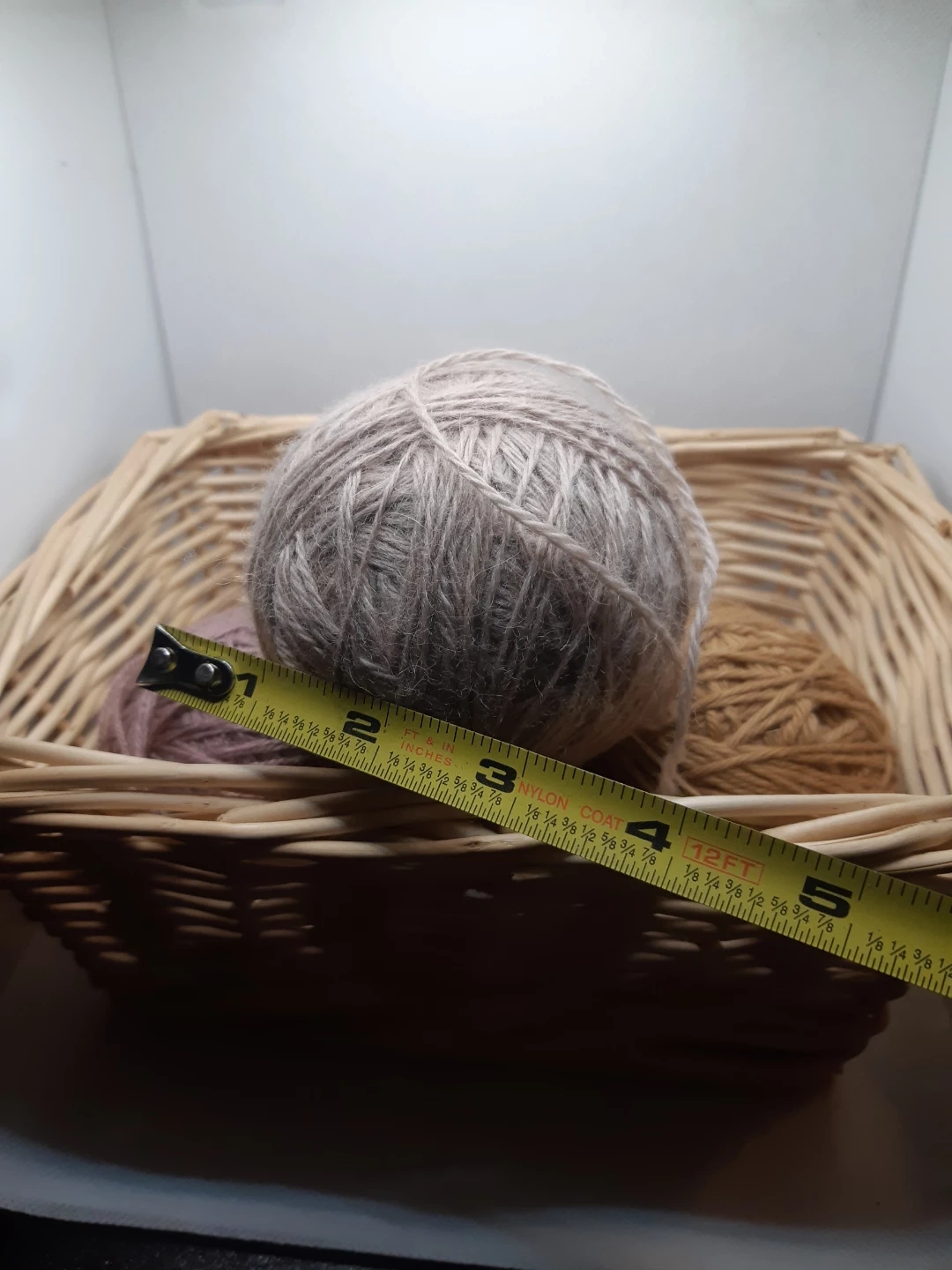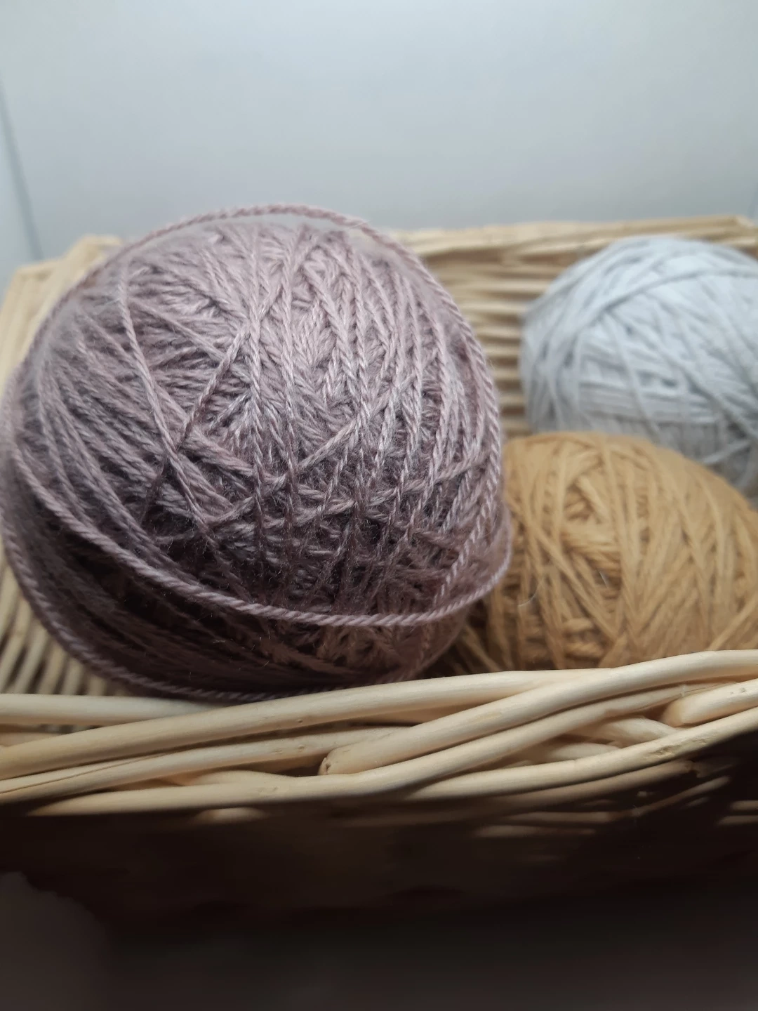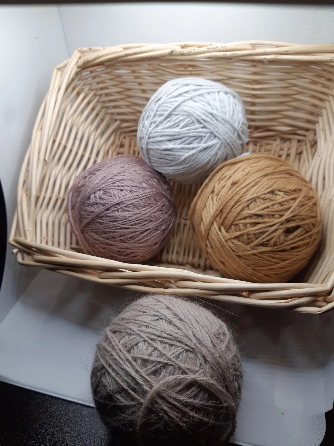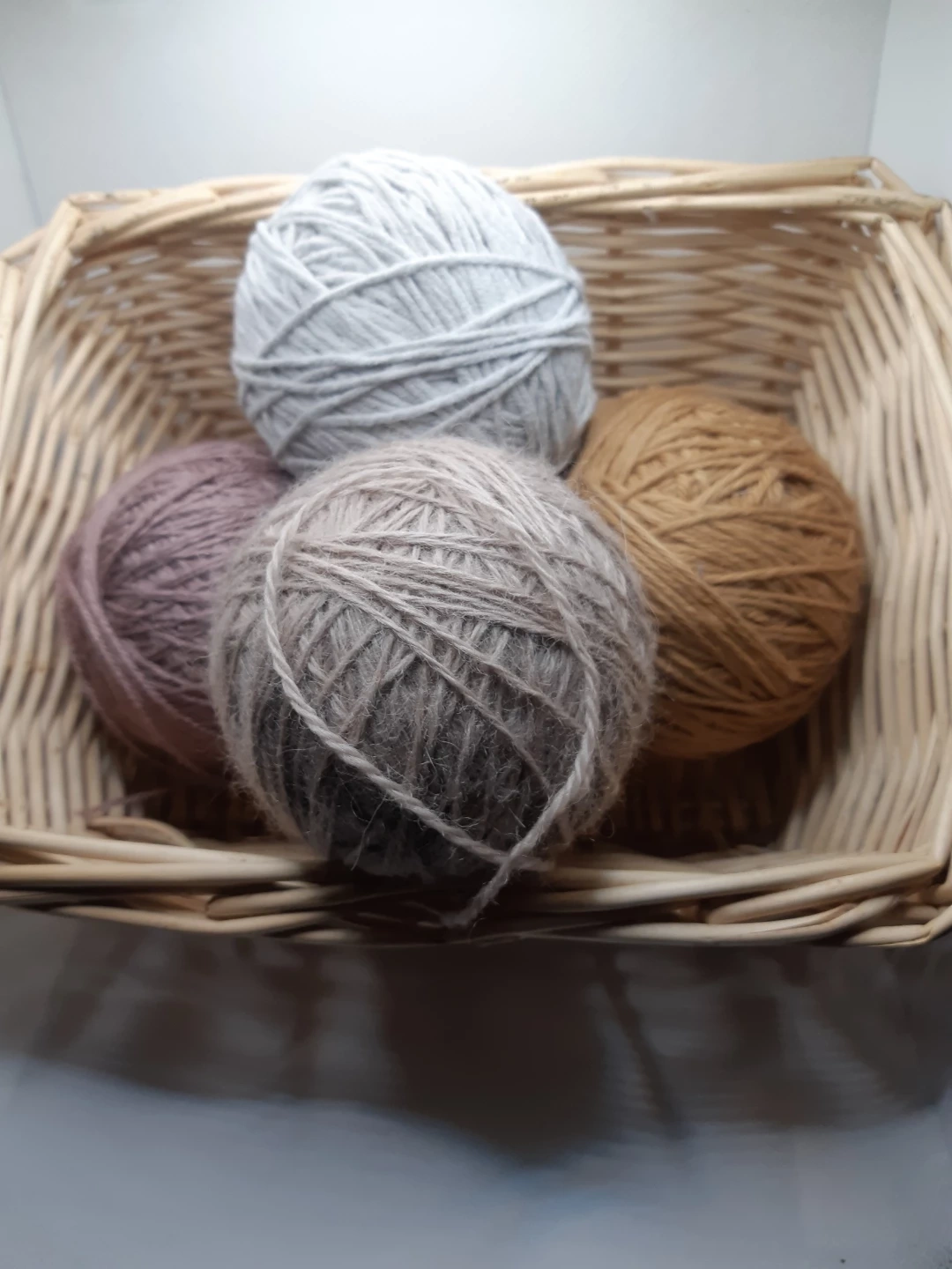 4 balls of yarn and the basket that holds them.