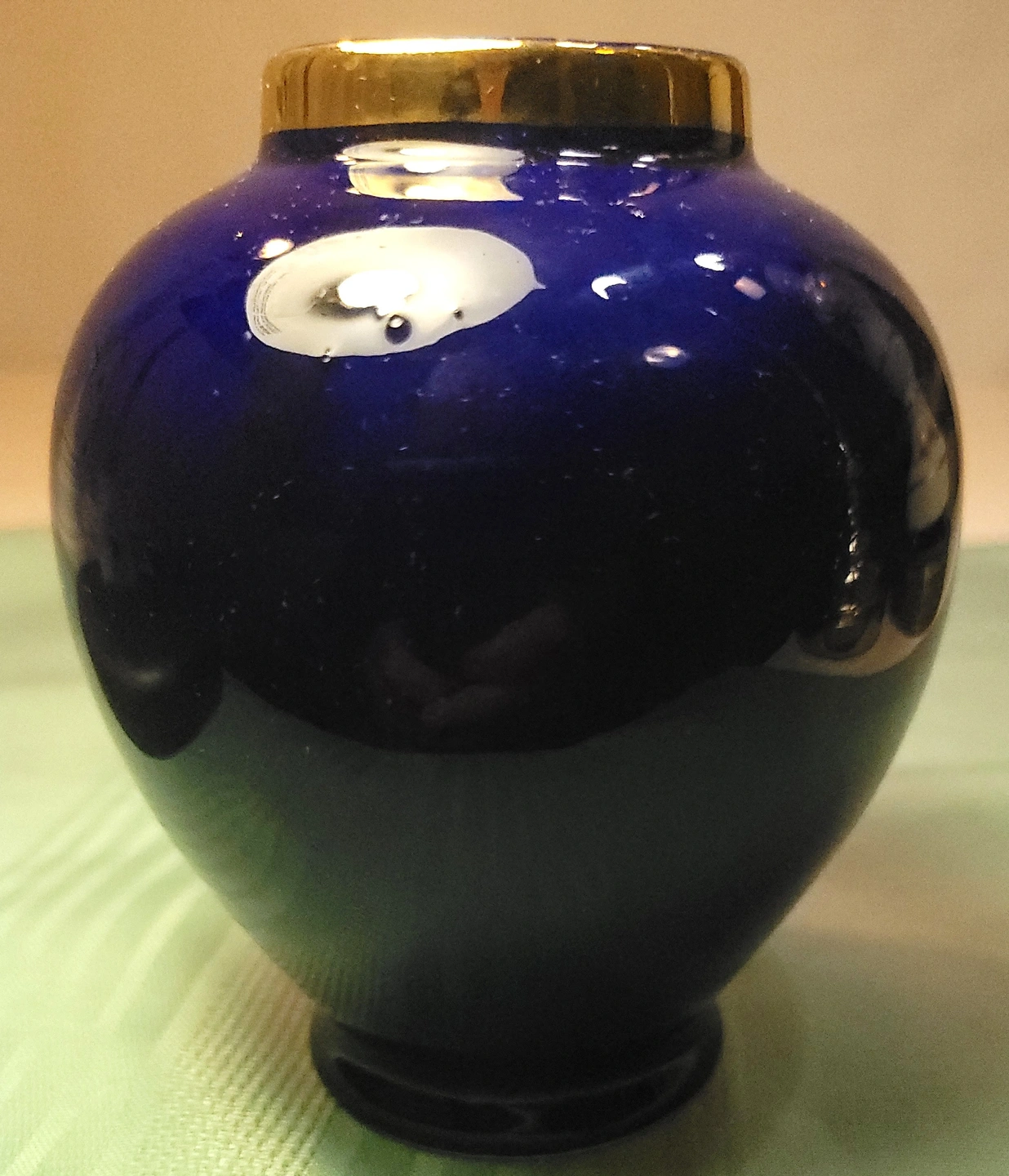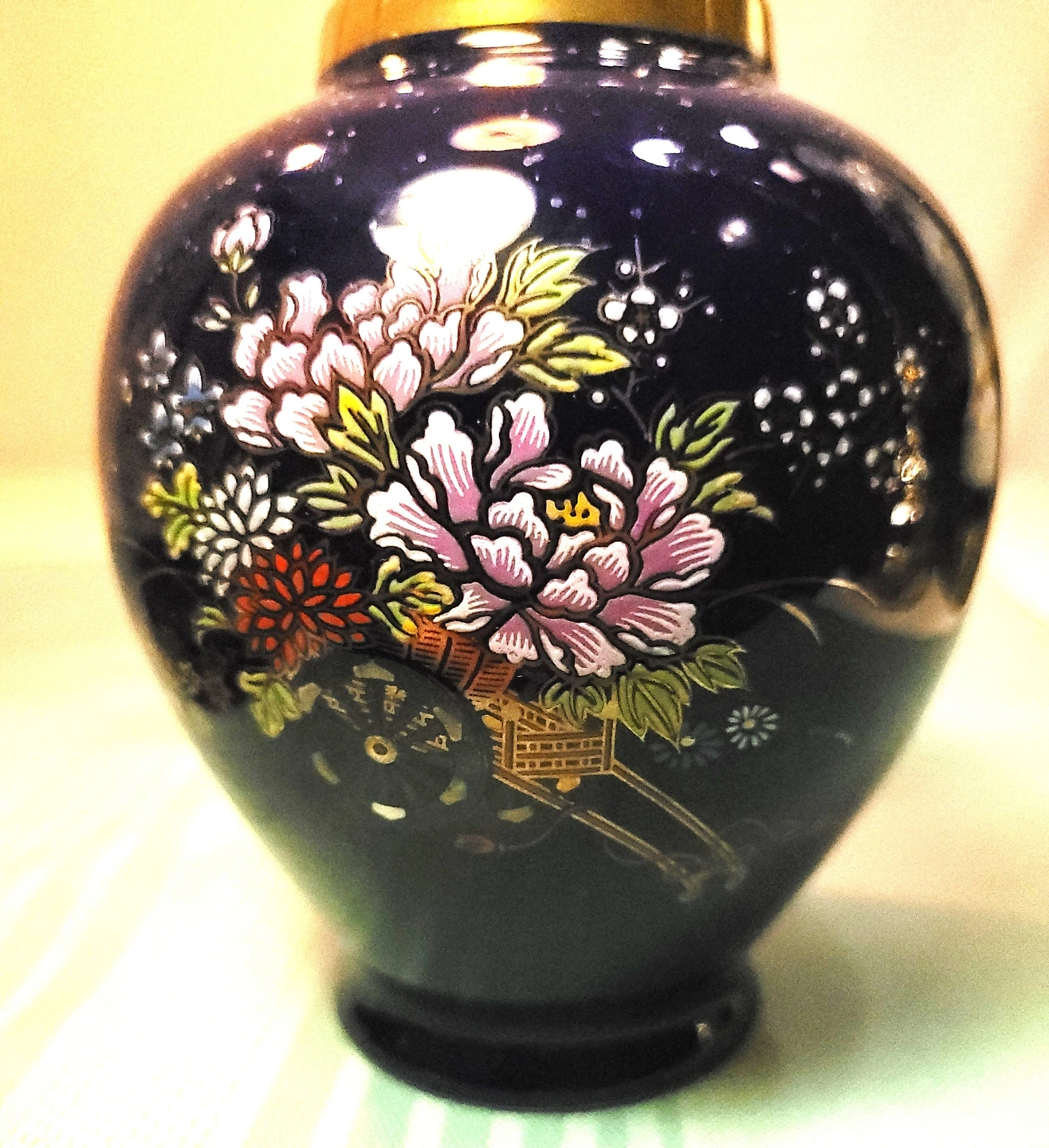 This piece features a classic rounded shape with a polished gold-tone rim. While originally designed as a ginger jar, please note that this item does not include a lid and is being sold as a decorative bud vase, which perfectly highlights its elegant proportions.