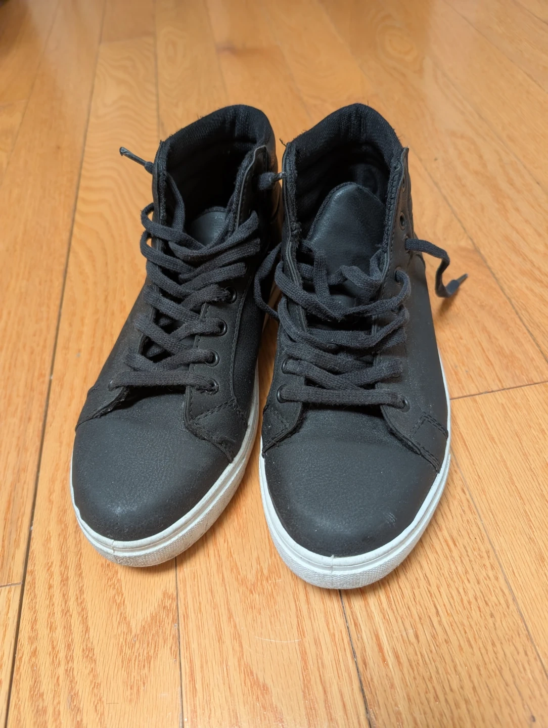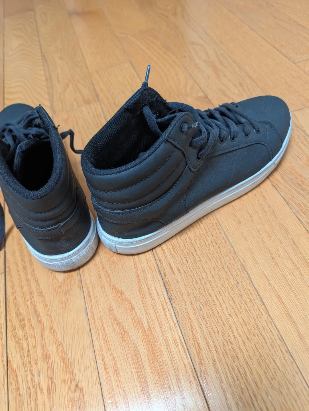 These black high-top sneakers are a versatile addition to any wardrobe. They feature a classic lace-up closure and durable construction. They're suitable for casual wear and everyday activities. Size 8-8.5