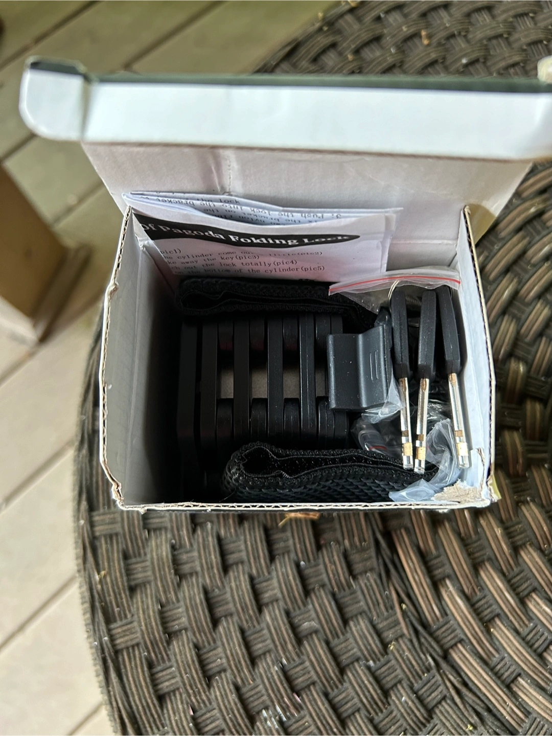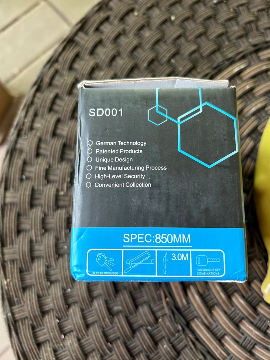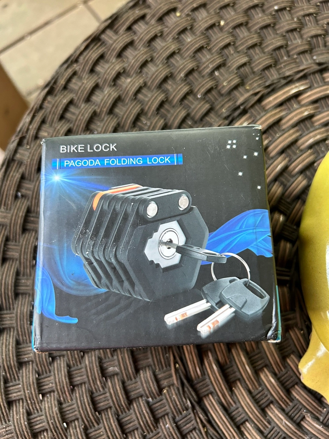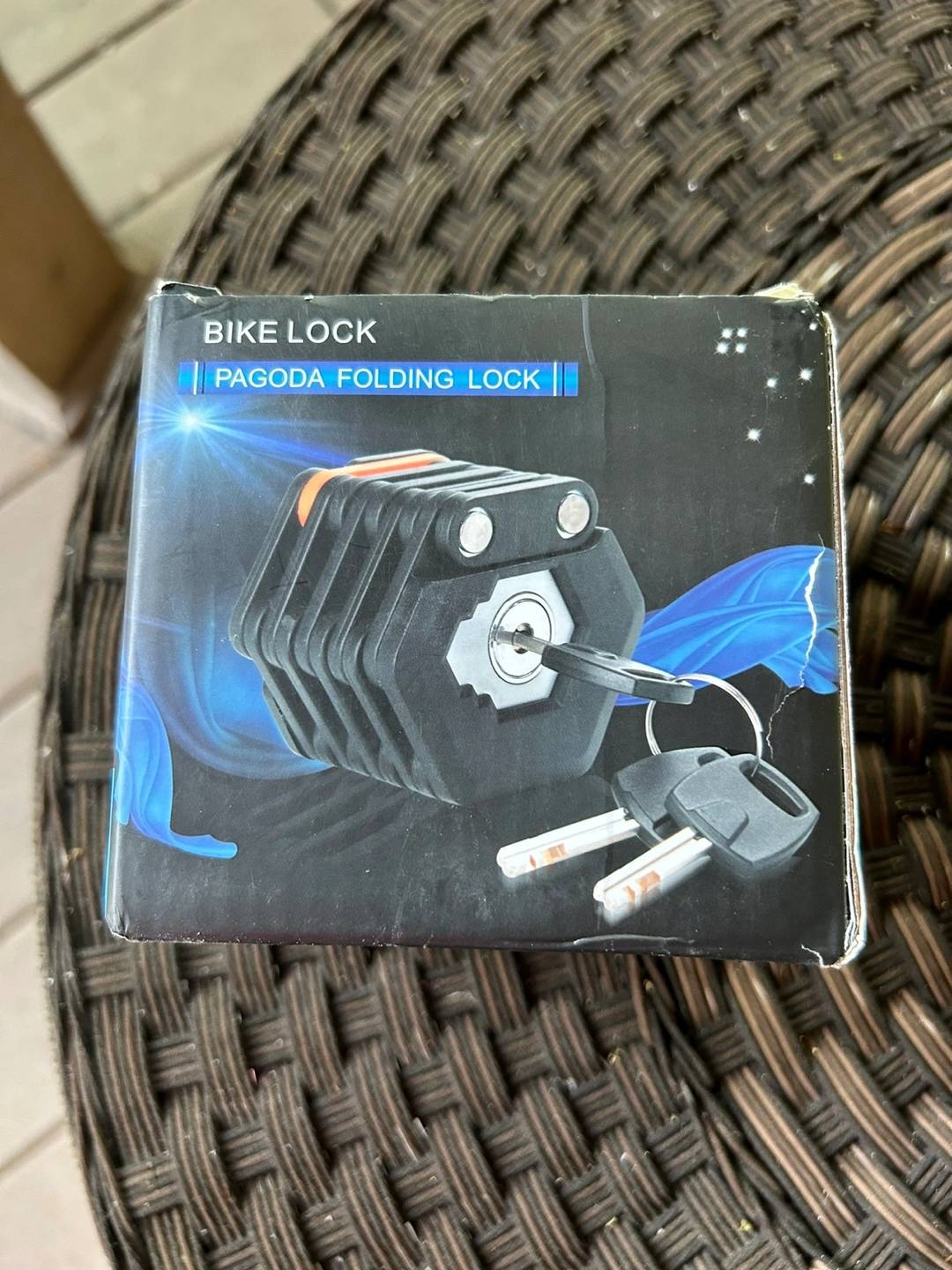 Selling a Pagoda folding bike lock. It's new condition and comes with the original box. The box shows it's 850mm and includes 3 keys. It features German Technology, a unique design, and high-level security. The box is damaged on top corners but lock is in new condition.