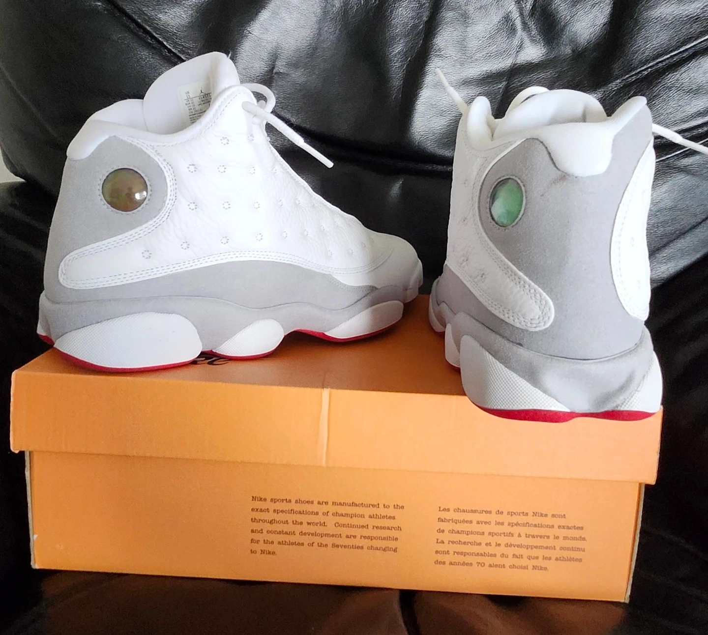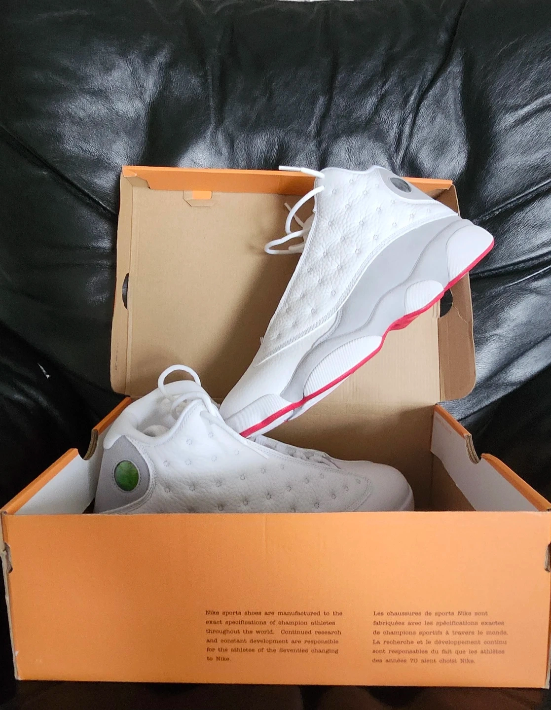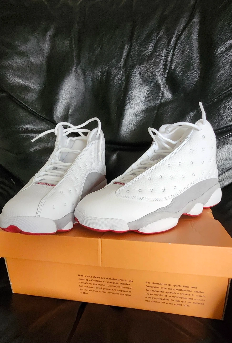 These Jordan 13 Retro sneakers are a clean white with grey and red accents. No box. Great for any sneaker collector!
