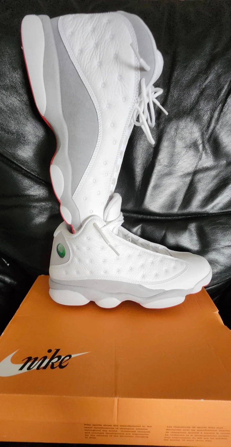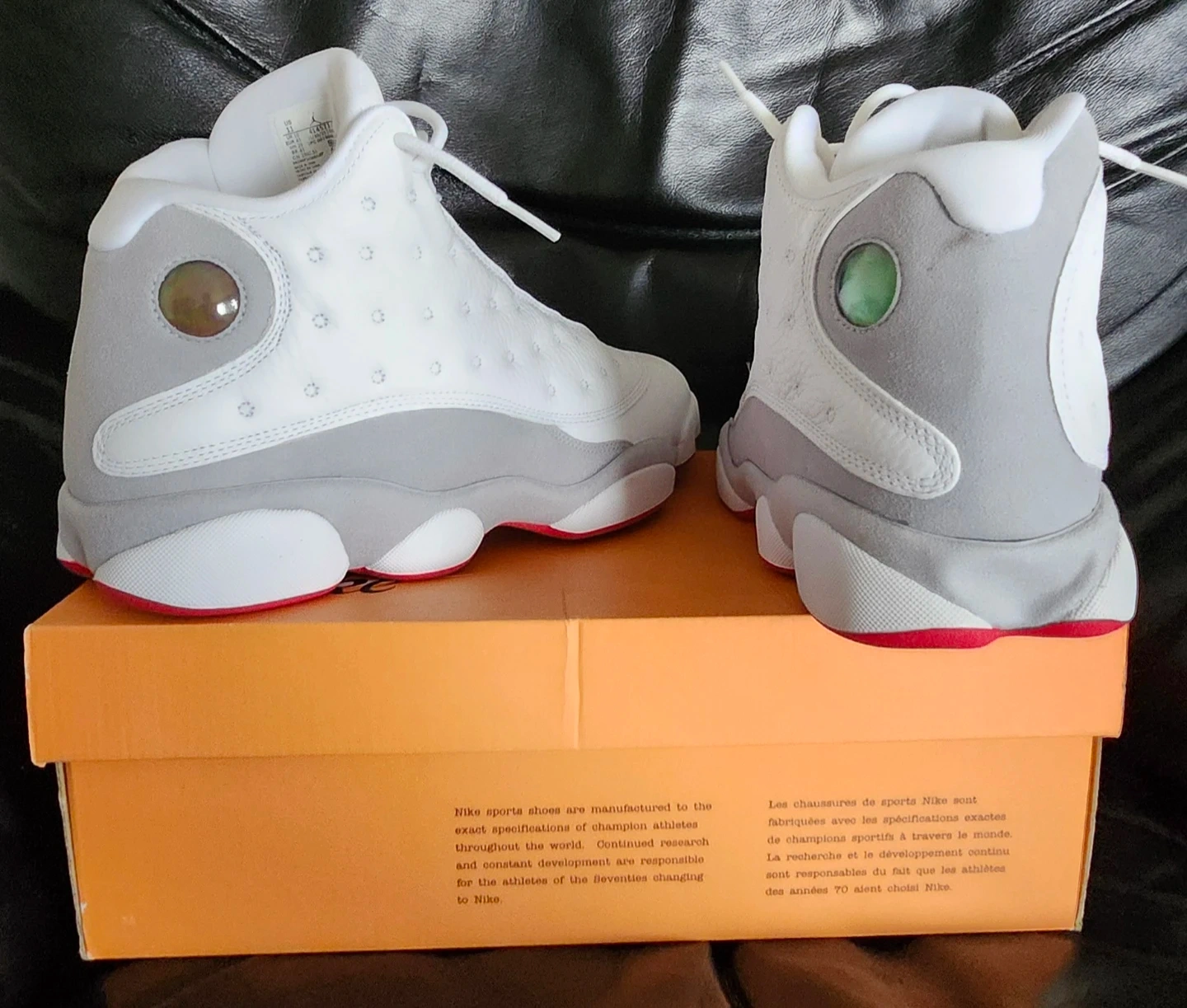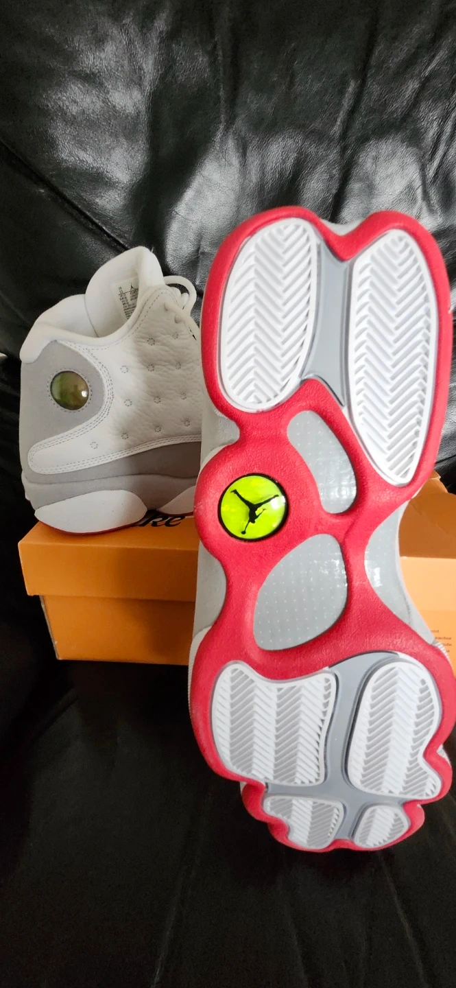 These Jordan 13 Retro sneakers are a clean white with grey and red accents. No box. Great for any sneaker collector!