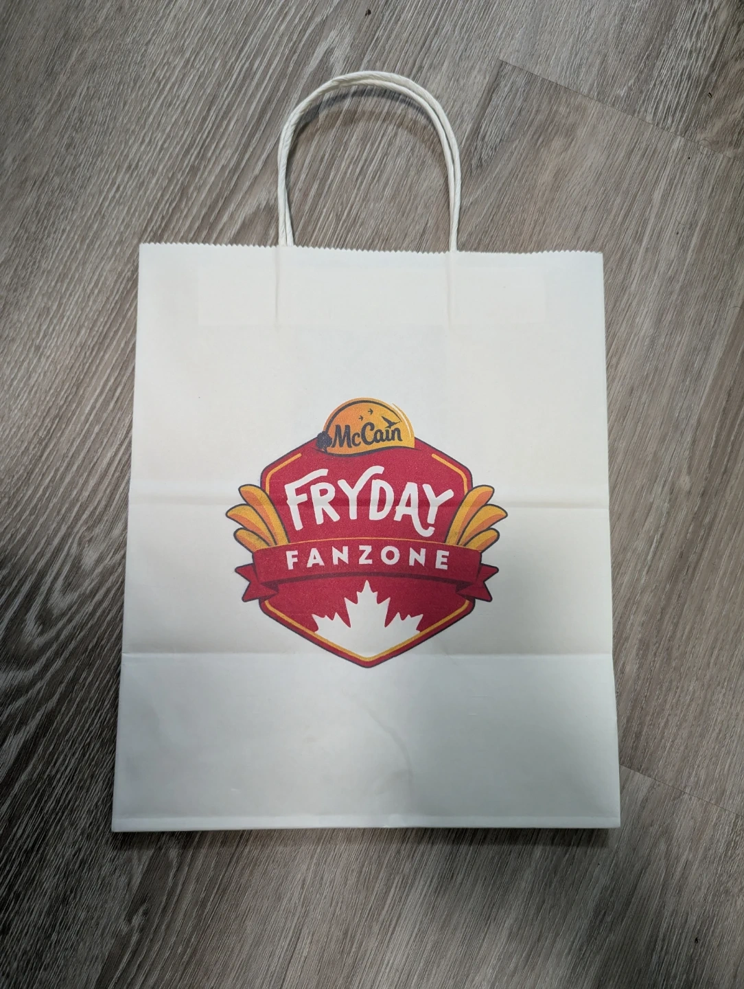 A white paper shopping bag from McCain's Fryday Fanzone. Features the McCain logo and a Canadian maple leaf design. Perfect for carrying snacks or small items!