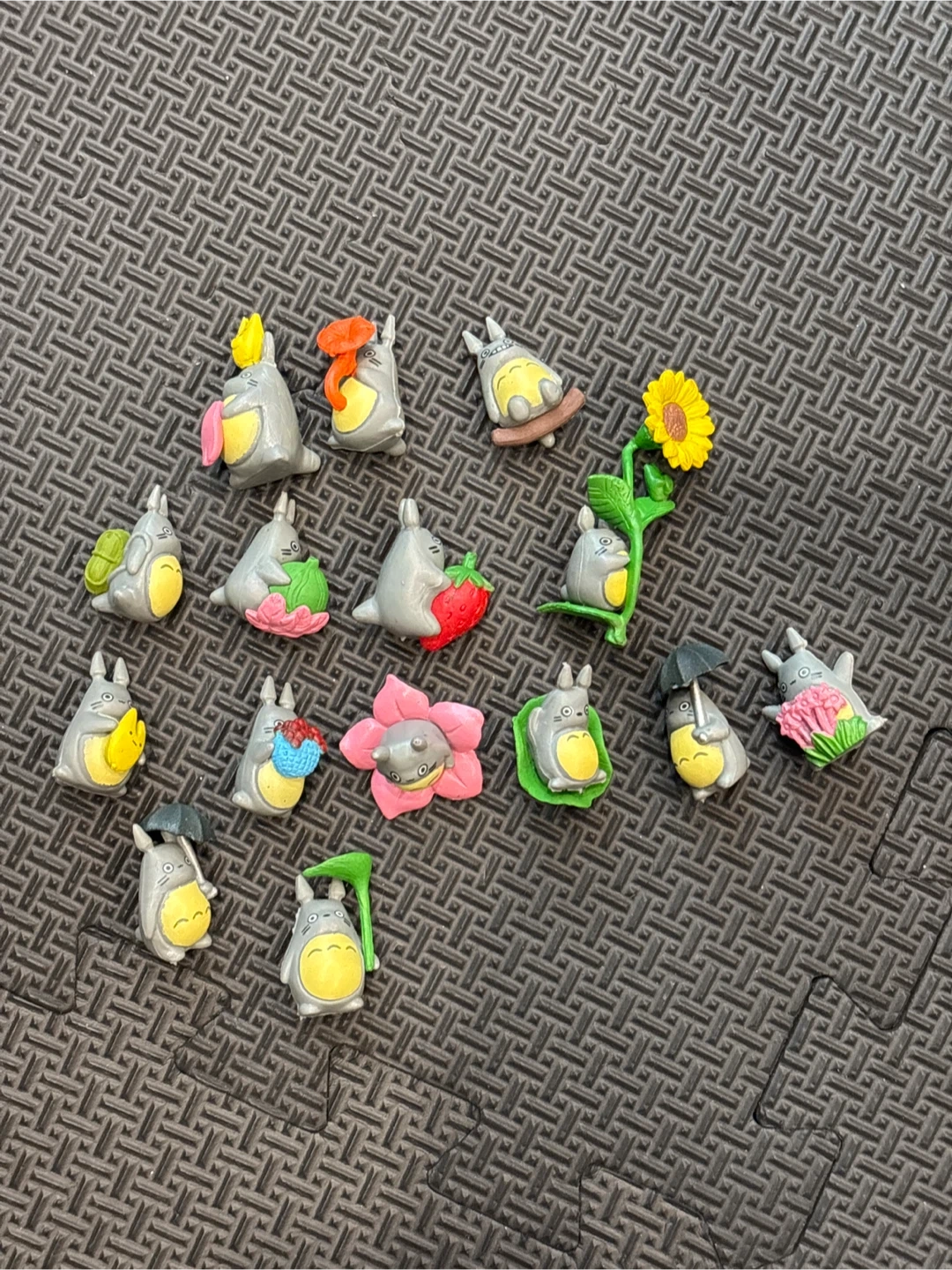 A collection of 14 Totoro mini figures, each with unique poses and accessories like a strawberry, umbrella, and flowers. These small figurines are perfect for display or playtime.