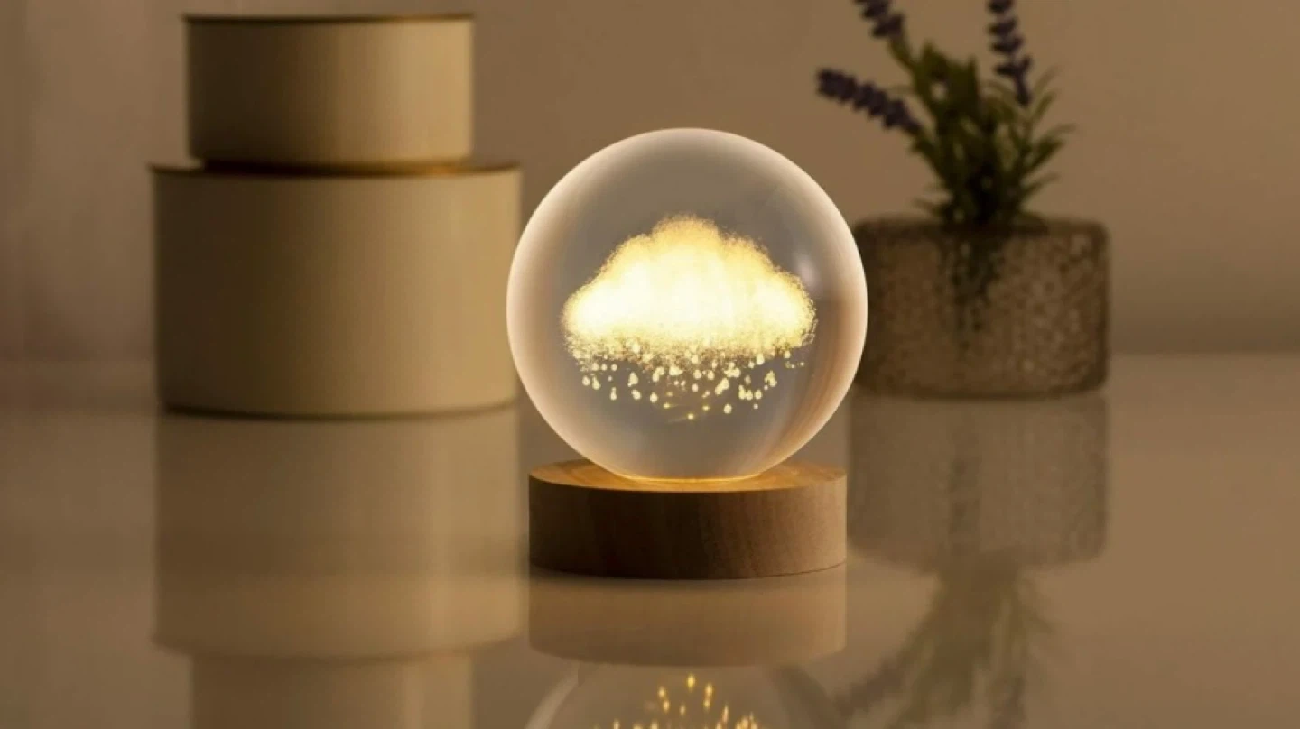 Merkury Innovations 3D Floating Cloud Crystal Orb Light with a wooden LED base. It's USB-operated and provides warm white LED light. Diameter is 3.15 inches.