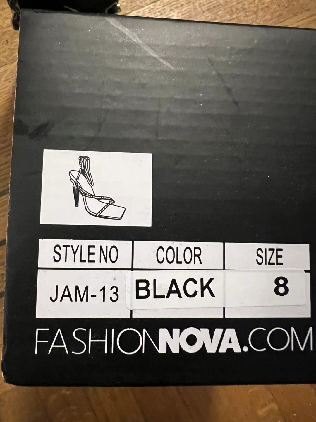 Selling a pair of Fashion Nova black heels in size 8. They have a stylish design with rhinestone detailing. The box is included!