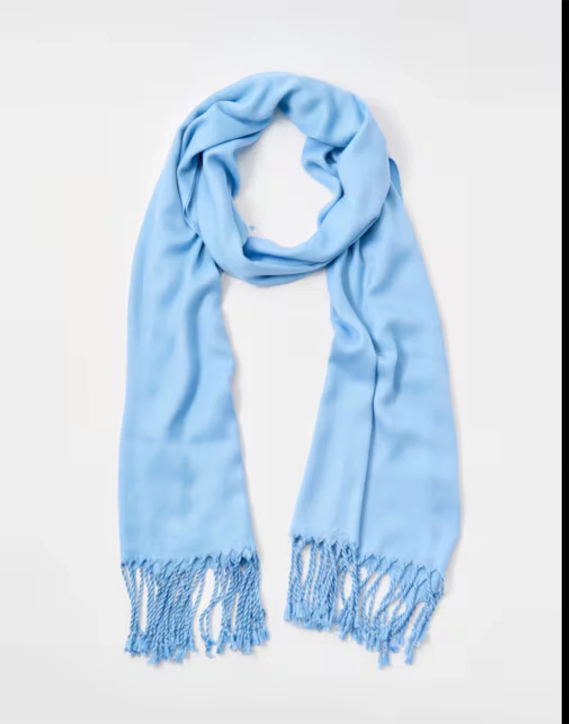 This is a light blue scarf with fringe accents on both ends. It's made of a soft material and drapes nicely. It's a versatile accessory that'll add a pop of colour to any outfit!