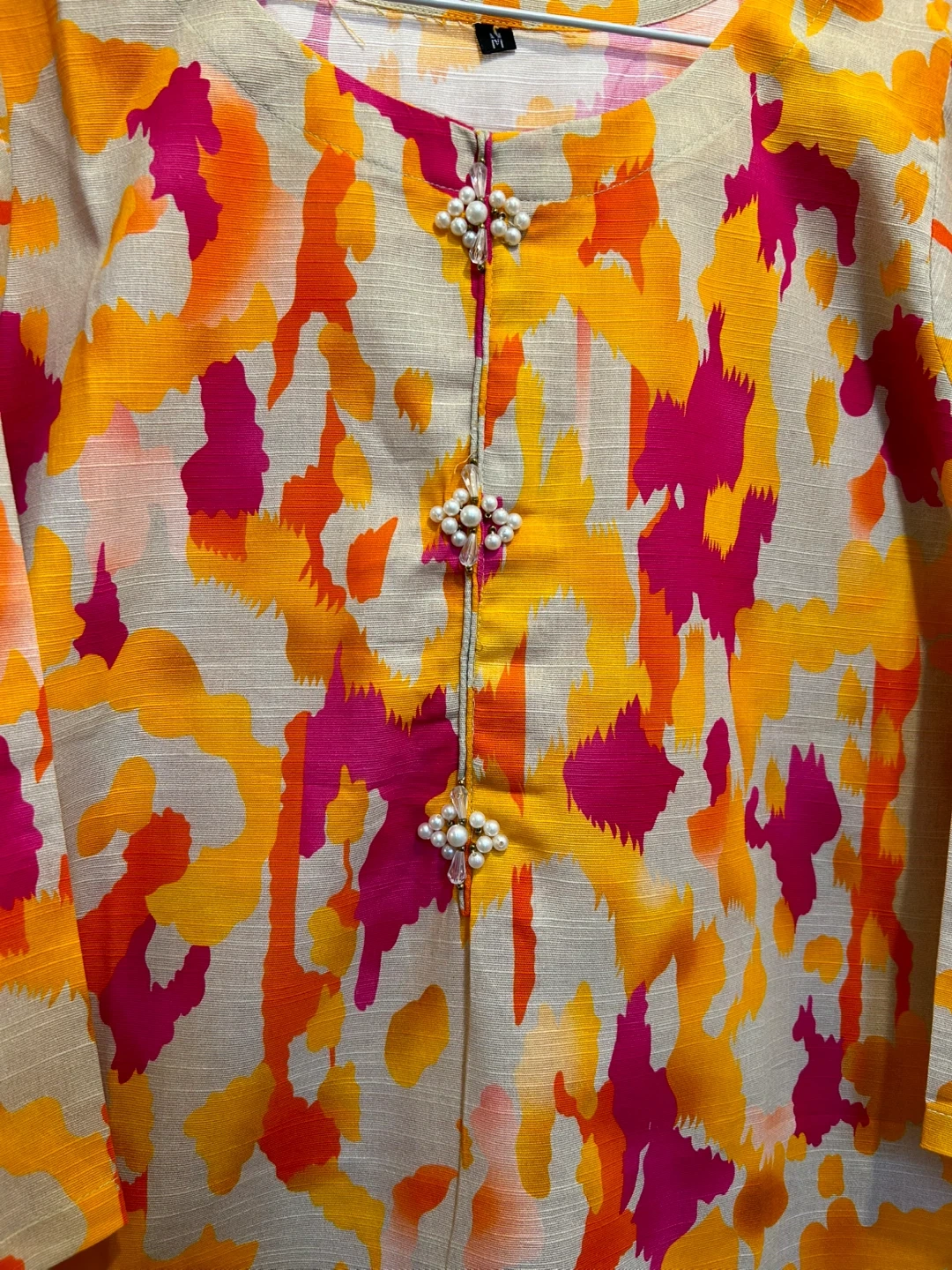 The chest measures 20" and the length is 34". It features a unique pattern with orange and pink hues, perfect for adding a pop of colour to your wardrobe
